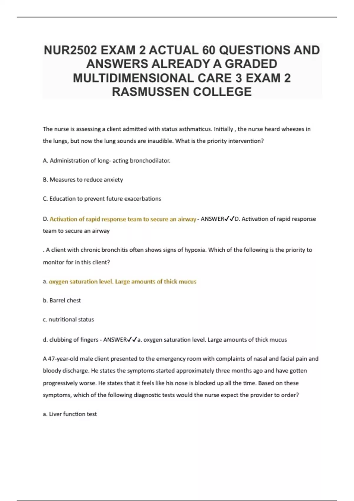 NUR2502 EXAM 2 ACTUAL 60 QUESTIONS AND ANSWERS ALREADY A GRADED MULTIDIMENSIONAL CARE 3 EXAM 2 RASMUSSEN COLLEGE