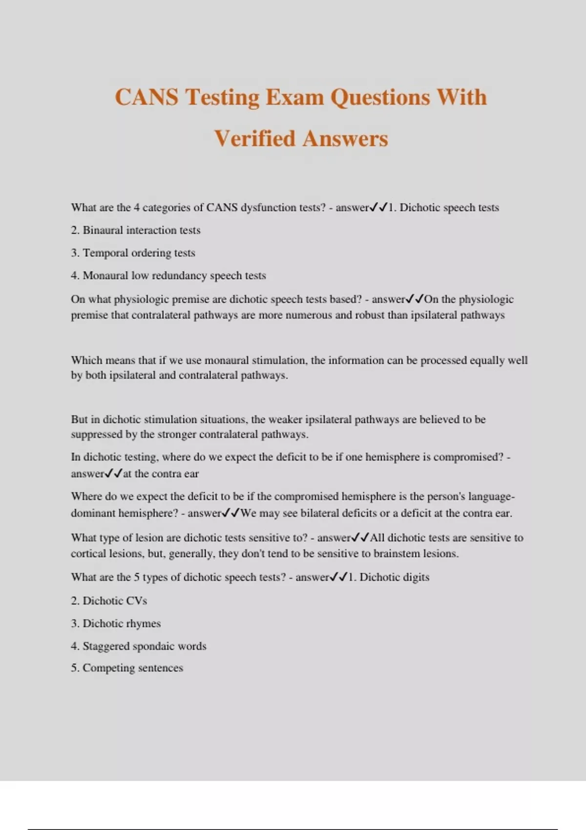 CANS Testing Exam Questions With Verified Answers What are the 4 categories of CANS dysfunction tests? - answer1. Dichotic speech tests 2. Binaural interaction tests 3. Temporal ordering tests 4. Monaural low redundancy speech tests On what physiologic premise are dichotic speech tests based? - answerOn the physiologic premise that contralateral pathways are more numerous and robust than ipsilateral pathways Which means that if we use monaural stimulation, the information can be processed equally well by both ipsilateral and contralateral pathways. But in dichotic stimulation situations, the weaker ipsilateral pathways are believed to be suppressed by the stronger contralateral pathways. In dichotic testing, where do we expect the deficit to be if one hemisphere is compromised? - answerat the contra ear Where do we expect the deficit to be if the compromised hemisphere is the person's language- dominant hemisphere? - answerWe may see bilateral deficits or a deficit at the contra ear. What type of lesion are dichotic tests sensitive to? - answerAll dichotic tests are sensitive to cortical lesions, but, generally, they don't tend to be sensitive to brainstem lesions. What are the 5 types of dichotic speech tests? - answer1. Dichotic digits 2. Dichotic CVs 3. Dichotic rhymes 4. Staggered spondaic words 5. Competing sentences Explain how the dichotic digits test works. - answerPresent 4 digits simultaneously (2 to each ear) at 50 dB SL relative to spondee threshold. Patient repeats back all the digits they hear. Derive a % correct for each ear and compare to norms. What are the norms for dichotic digits? - answer11 years old or older: abnormal = <90% at either ear What result would you expect on dichotic digits for a person with a right temporal lobe lesion? - answer<90% correct for the left ear Why would you expect a bilateral deficit in a dichotic speech test for patients with left temporal lobe lesions? - answerMost people's left hemisphere is the language-dominant hemisphere, and they have to use language to report their answers. When would a left hemisphere lesion maybe no show a bilateral deficit in dichotic speech tests? - answerIf the lesion is deep within the left hemisphere,a s they tend to affect the corpus callosum. Explain how the dichotic CVs test works. - answerPresent CVs dichotically at 50 dB SL relative to spondee thresholds; can be presented simultaneously or in lead-lag fashion. Patient repeats what they heard. Derive a % correct for each ear and compare to norms. What are the norms for dichotic CVs? - answerAbnormal adult performance = <43% for either ear in simultaneous condition OR <90% for either ear in lead-lag condition Is simultaneous or lead-lag presentation more difficult for dichotic CVs? - answersimulatenous What is lead-lag fashion? - answerWhen you are presenting stimuli dichotically, you introduce one to one ear slightly before the other CV is introduced to the other ear. What are some commonly used CVs in dichotic CVs? - answerba, pa, ta, ka, ga, da Explain how dichotic rhymes works. - answerPresent 30-50 pairs of monosyllabic words that begin with a stop consonant and differ only in the initial consonant (i.e., bat, cat) at 50 dB SL relative to spondee thresholds. Patient repeats what they hear. Derive a % correct for each ear and compare to norms.