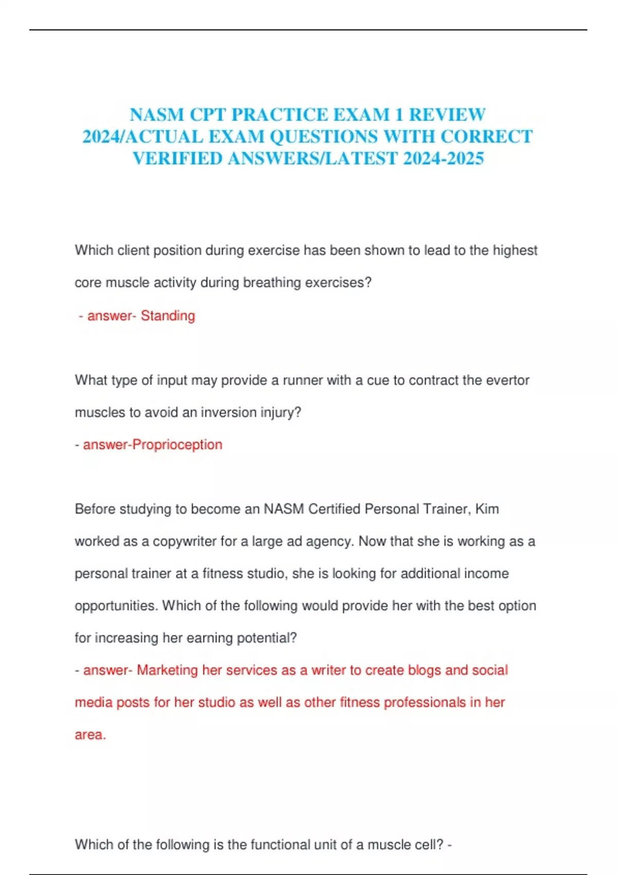 NASM CPT PRACTICE EXAM 1 REVIEW 2024/ACTUAL EXAM QUESTIONS WITH CORRECT VERIFIED ANSWERS/LATEST