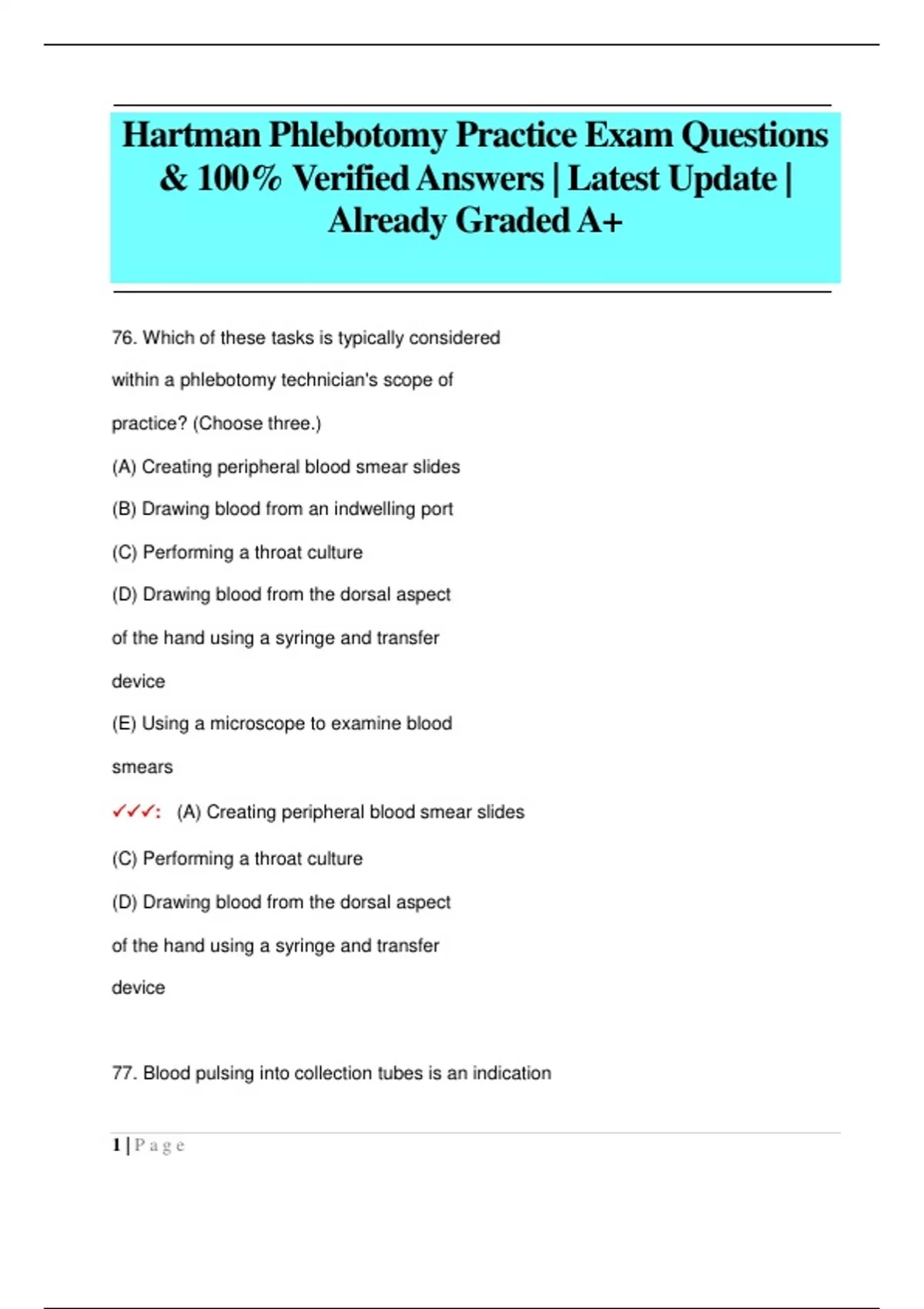 76. Which of these tasks is typically considered within a phlebotomy technician's scope of practice? (Choose three.) (A) Creating peripheral blood smear slides (B) Drawing blood from an indwelling port (C) Performing a throat culture (D) Drawing blood from the dorsal aspect of the hand using a syringe and transfer device (E) Using a microscope to examine blood smears : (A) Creating peripheral blood smear slides (C) Performing a throat culture (D) Drawing blood from the dorsal aspect of the hand using a syringe and transfer device 77. Blood pulsing into collection tubes is an indication 2 | P a g e that (A) The needle is placed in the exact center of the vein (B) The needle has struck a nerve (C) The needle has passed entirely through the vein (D) The needle has struck an artery : (D) The needle has struck an artery 78. A phlebotomist needs to collect gold, pink, and green-topped tubes by venipuncture. Which order is correct? (A) Gold, green, pink (B) Green, gold, pink (C) Pink, green, gold (D) Gold, pink, green : (A) Gold, green, pink 79. Collection tubes with ___________________ _____________ should not be used for therapeutic drug testing. (A) Separator gel (B) Clot activato