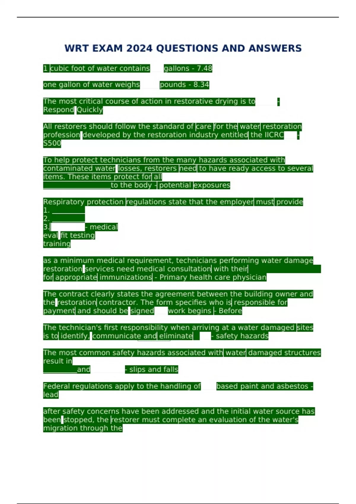 WRT EXAM 2024 QUESTIONS AND ANSWERS 1 cubic foot of water contains gallons - 7.48