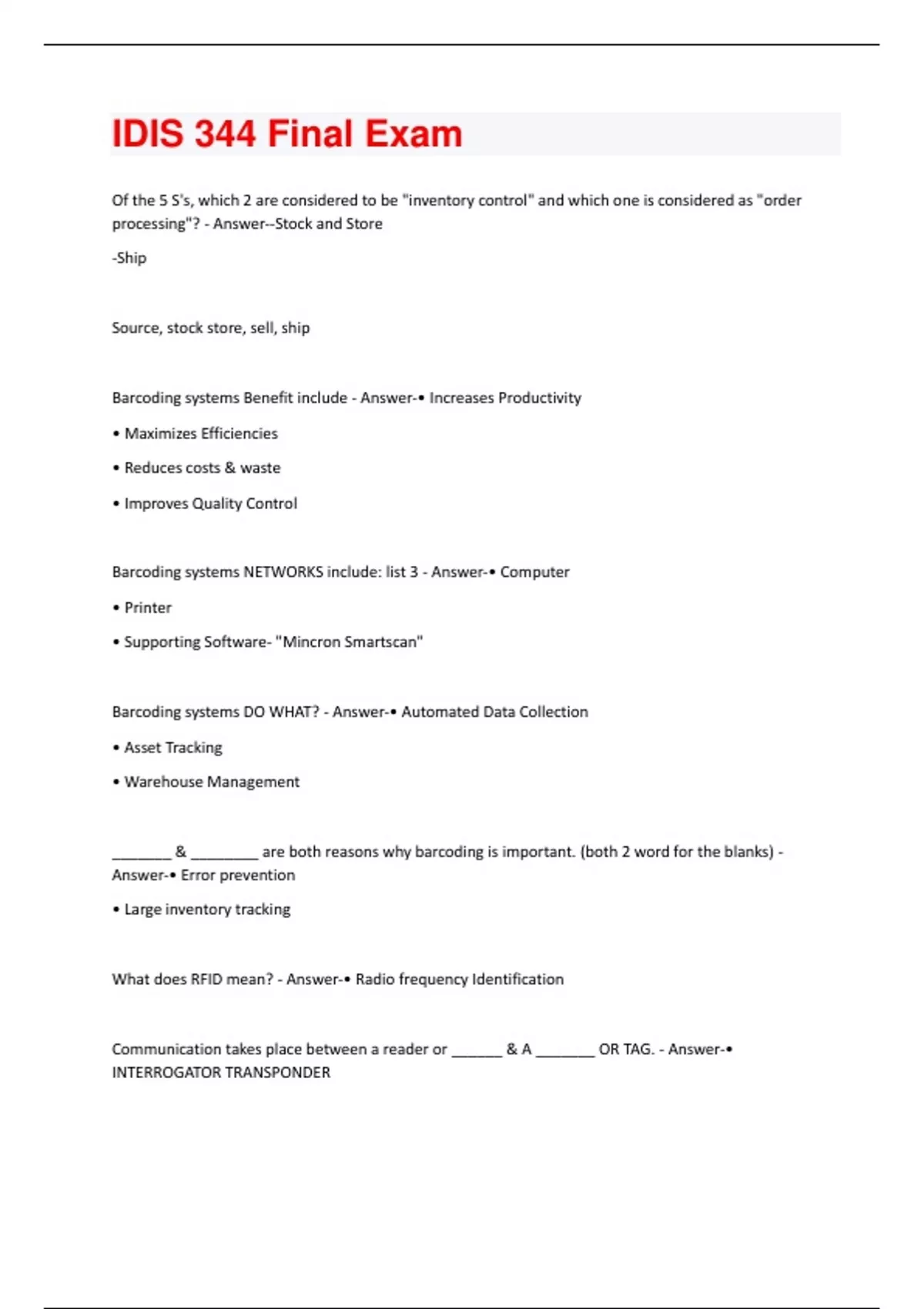 Of the 5 S's, which 2 are considered to be "inventory control" and which one is considered as "order processing"? - Answer--Stock and Store -Ship Source, stock store, sell, ship Barcoding systems Benefit include - Answer-• Increases Productivity • Maximizes Efficiencies • Reduces costs & waste • Improves Quality Control Barcoding systems NETWORKS include: list 3 - Answer-• Computer • Printer • Supporting Software- "Mincron Smartscan" Barcoding systems DO WHAT? - Answer-• Automated Data Collection • Asset Tracking • Warehouse Management _______ & ________ are both reasons why barcoding is important. (both 2 word for the blanks) - Answer-• Error prevention • Large inventory tracking What does RFID mean? - Answer-• Radio frequency Identification Communication takes place between a reader or ______ & A _______ OR TAG. - Answer-• INTERROGATOR TRANSPONDERTags can either be active (powered by a ------ ) or passive (powered by the ------- ). - Answer-• Battery • Reader field How does an RFID transmit info? - Answer-• Tag passes through a field generated by a reader • RFID transmits the info back which IDs the object. What are 3 benefits of using an RFID over Barcode? - Answer-• Does not require line of sight reading • Tags are less susceptible to poor environmental conditions • Data can be changed passing thru specific operations. ______ , ________ , and _________ are 3 reasons why RF is important. (2 word for the blanks) "PI, EE, IB" - Answer-• Productivity improvements • Eliminate errors • Immediate benefits SCANSMART OVERVIEW (6 scenarios) - Answer-• PO RECEIVING • TRANSFER RECEIVING • PUTAWAY • PICKING • VERIFICATION • PHYSICAL INVENTORY