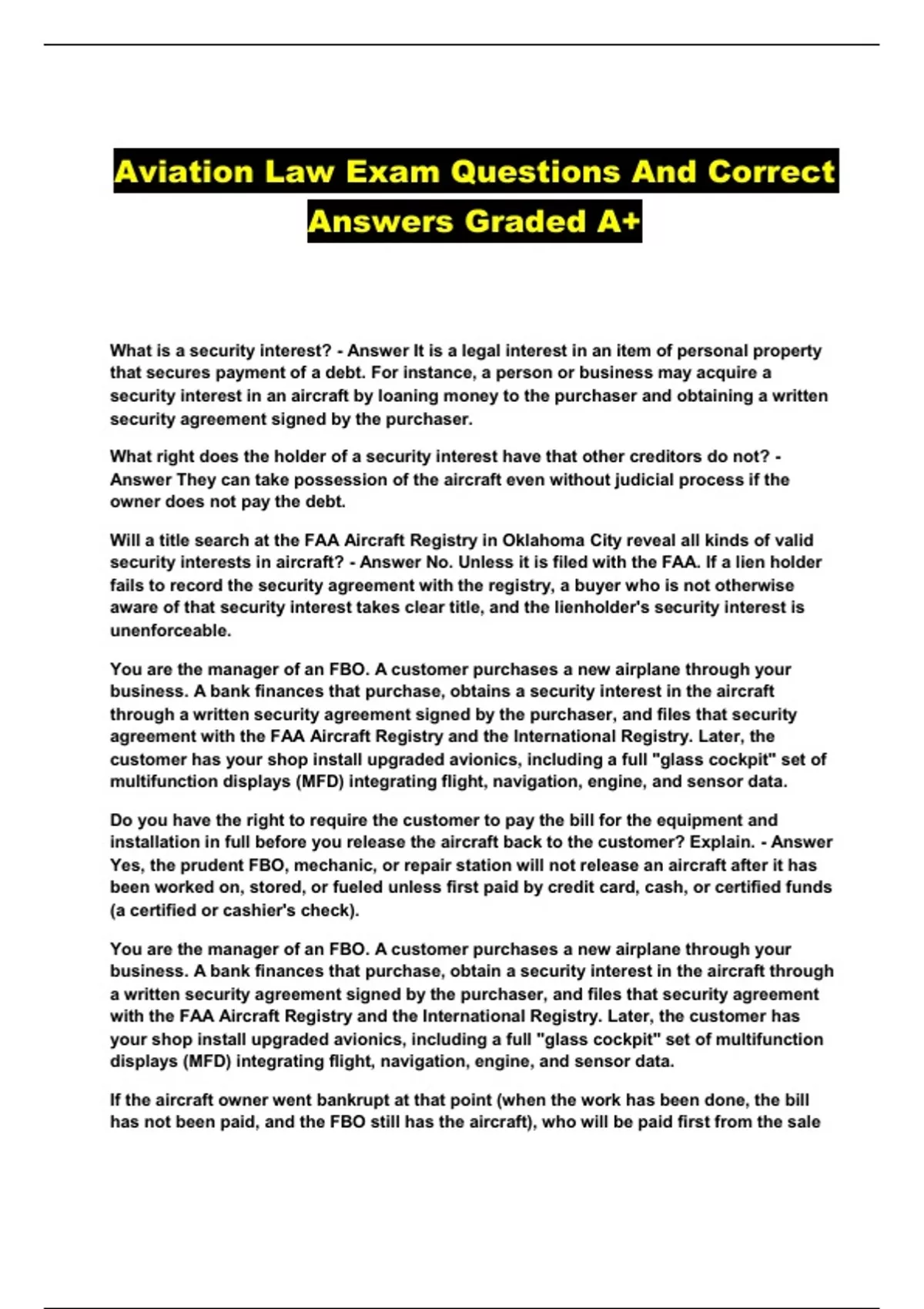 Aviation Law Exam Questions And Correct Answers Graded A+
