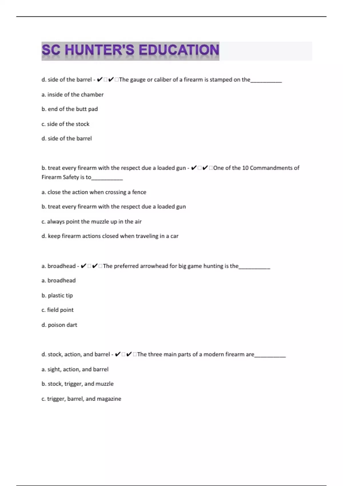 d. side of the barrel - ️️The gauge or caliber of a firearm is stamped on the__________ a. inside of the chamber b. end of the butt pad c. side of the stock d. side of the barrel b. treat every firearm with the respect due a loaded gun - ️️One of the 10 Commandments of Firearm Safety is to__________ a. close the action when crossing a fence b. treat every firearm with the respect due a loaded gun c. always point the muzzle up in the air d. keep firearm actions closed when traveling in a car a. broadhead - ️️The preferred arrowhead for big game hunting is the__________ a. broadhead b. plastic tip c. field point d. poison dart d. stock, action, and barrel - ️️The three main parts of a modern firearm are__________ a. sight, action, and barrel b. stock, trigger, and muzzle c. trigger, barrel, and magazine