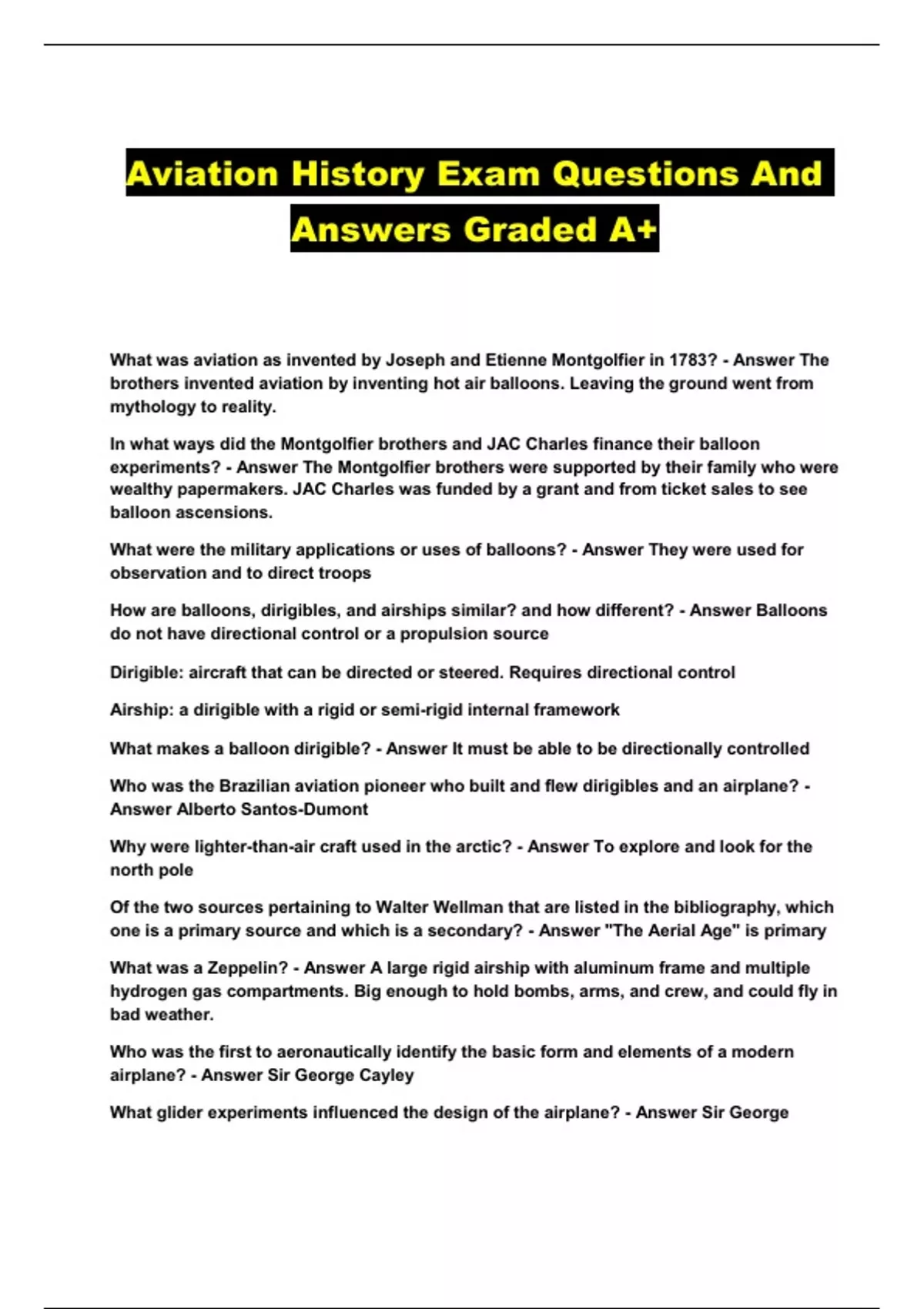 Aviation History Exam Questions And Answers Graded A+...