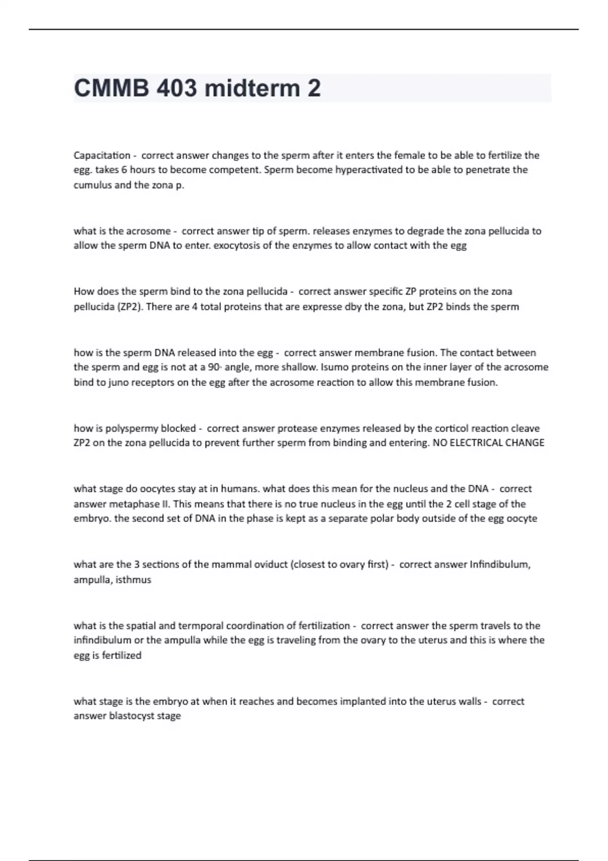 CMMB 403 midterm 2 Questions with complete solutionCMMB 403 midterm 2 Capacitation - correct answer changes to the sperm after it enters the female to be able to fertilize the egg. takes 6 hours to become competent. Sperm become hyperactivated to be able to penetrate the cumulus and the zona p. what is the acrosome - correct answer tip of sperm. releases enzymes to degrade the zona pellucida to allow the sperm DNA to enter. exocytosis of the enzymes to allow contact with the egg How does the sperm bind to the zona pellucida - correct answer specific ZP proteins on the zona pellucida (ZP2). There are 4 total proteins that are expresse dby the zona, but ZP2 binds the sperm how is the sperm DNA released into the egg - correct answer membrane fusion. The contact between the sperm and egg is not at a 90∙ angle, more shallow. Isumo proteins on the inner layer of the acrosome bind to juno receptors on the egg after the acrosome reaction to allow this membrane fusion. how is polyspermy blocked - correct answer protease enzymes released by the corticol reaction cleave ZP2 on the zona pellucida to prevent further sperm from binding and entering. NO ELECTRICAL CHANGE what stage do oocytes stay at in humans. what does this mean for the nucleus and the DNA - correct answer metaphase II. This means that there is no true nucleus in the egg until the 2 cell stage of the embryo. the second set of DNA in the phase is kept as a separate polar body outside of the egg oocyte