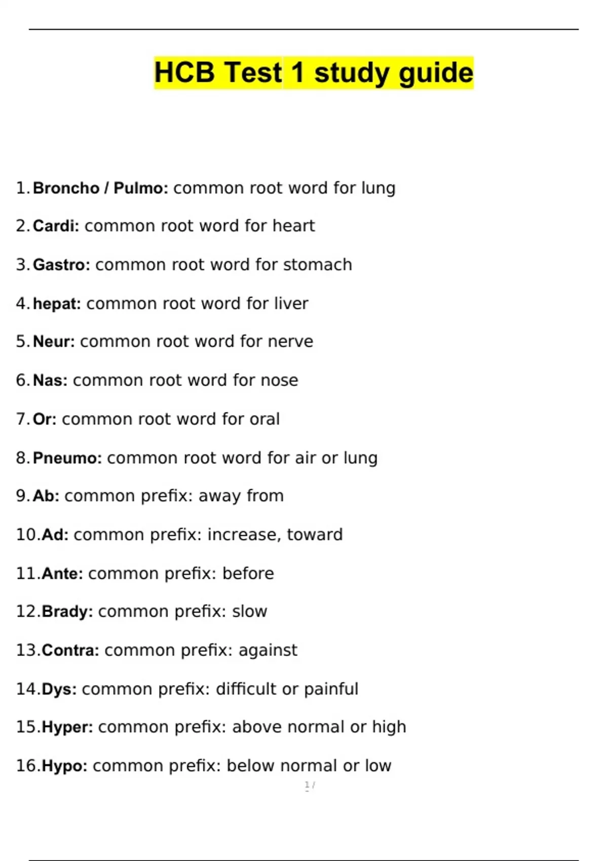 1. Broncho / Pulmo: common root word for lung 2. Cardi: common root word for heart 3. Gastro: common root word for stomach 4. hepat: common root word for liver 5. Neur: common root word for nerve 6. Nas: common root word for nose 7. Or: common root word for oral 8. Pneumo: common root word for air or lung 9. Ab: common prefix: away from 10. Ad: common prefix: increase, toward 11. Ante: common prefix: before 12. Brady: common prefix: slow 13. Contra: common prefix: against 14. Dys: common prefix: difficult or painful 15. Hyper: common prefix: above normal or high 16. Hypo: common prefix: below normal or low 17. Inter: common prefix: between 18. Peri: common prefix: around 19. Poly: common prefix: many 20. Post: common prefix: after