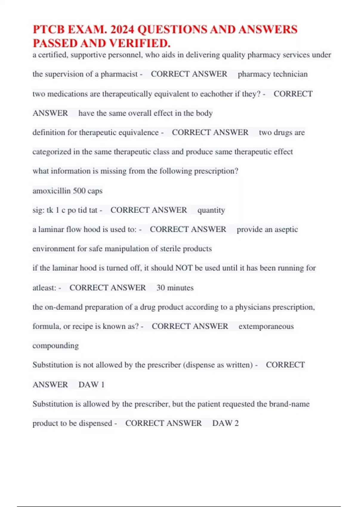 PTCB EXAM. 2024 QUESTIONS AND ANSWERS PASSED AND VERIFIED.