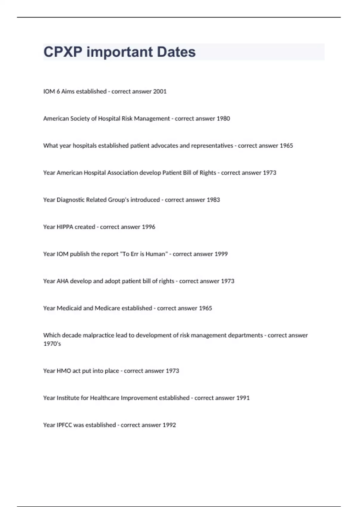 CPXP important Dates Question and answers verified to passCPXP important Dates IOM 6 Aims established - correct answer 2001 American Society of Hospital Risk Management - correct answer 1980 What year hospitals established patient advocates and representatives - correct answer 1965 Year American Hospital Association develop Patient Bill of Rights - correct answer 1973 Year Diagnostic Related Group's introduced - correct answer 1983 Year HIPPA created - correct answer 1996 Year IOM publish the report "To Err is Human" - correct answer 1999 Year AHA develop and adopt patient bill of rights - correct answer 1973 Year Medicaid and Medicare established - correct answer 1965 Which decade malpractice lead to development of risk management departments - correct answer 1970's Year HMO act put into place - correct answer 1973 Year Institute for Healthcare Improvement established - correct answer 1991 Year IPFCC was establish