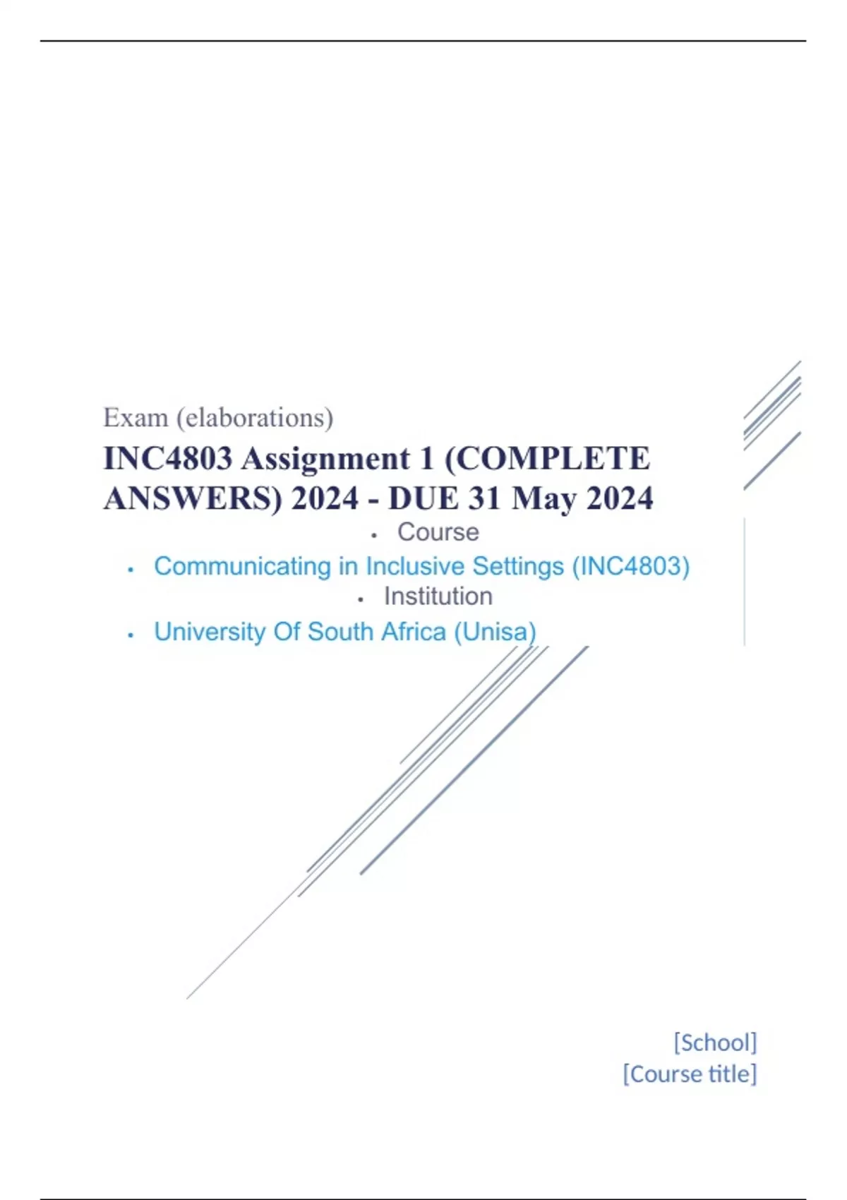 Exam (elaborations) INC4803 Assignment 1 (COMPLETE ANSWERS) 2024 - DUE 31 May 2024 • Course • Communicating in Inclusive Settings (INC4803) • Institution • University Of South Africa (Unisa) • Book • Teaching Students with Special Needs in Inclusive Settings: Pearson International Edition INC4803 Assignment 1 (COMPLETE ANSWERS) 2024 - DUE 31 May 2024 ;100% TRUSTED workings, explanations and soluti ons. for assistance Whats-App..............