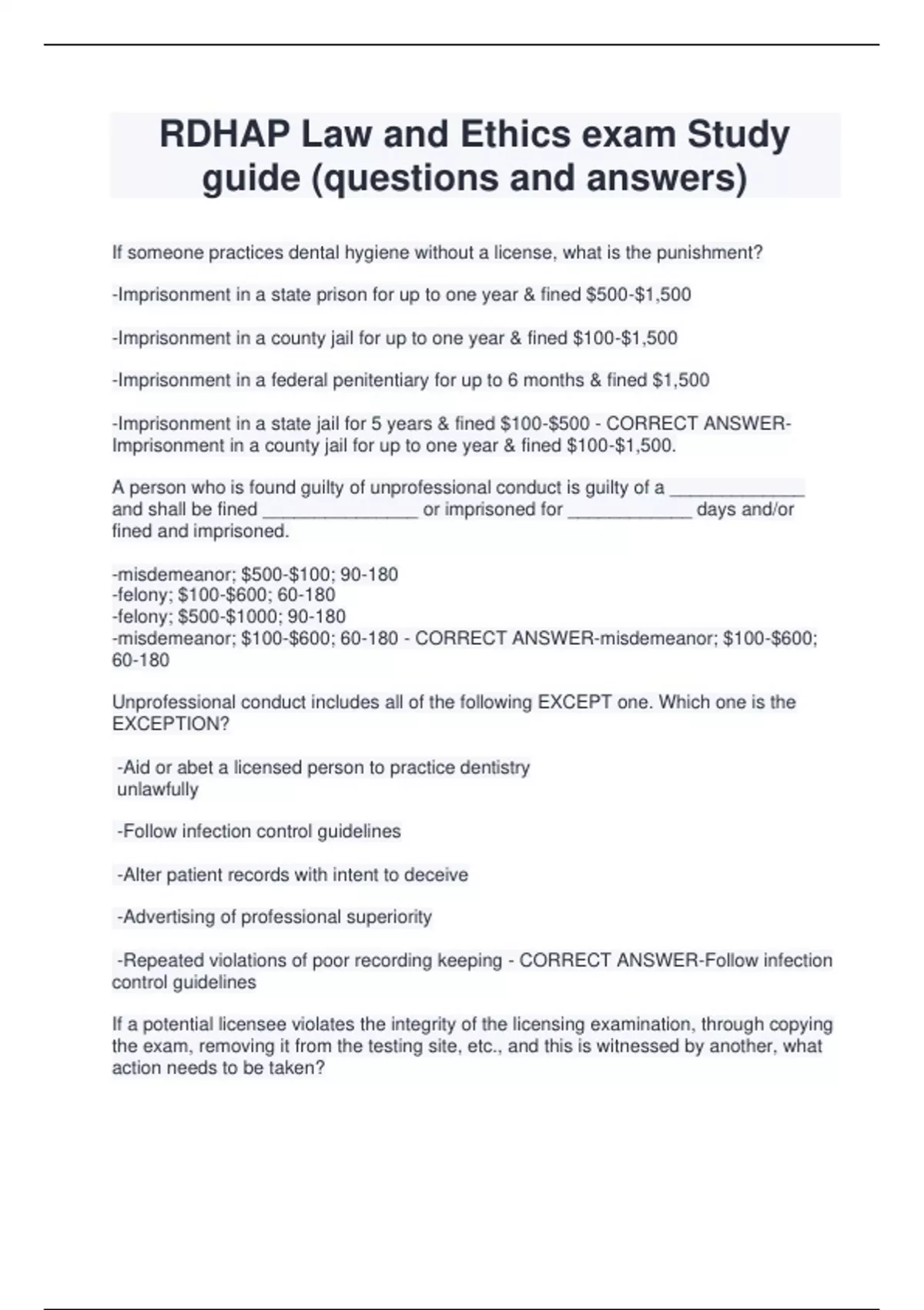 RDHAP Law and Ethics exam Study guide (questions and answers) If someone practices dental hygiene without a license, what is the punishment? -Imprisonment in a state prison for up to one year & fined $500-$1,500 -Imprisonment in a county jail for up to one year & fined $100-$1,500 -Imprisonment in a federal penitentiary for up to 6 months & fined $1,500 -Imprisonment in a state jail for 5 years & fined $100-$500 - CORRECT ANSWERImprisonment in a county jail for up to one year & fined $100-$1,500. A person who is found guilty of unprofessional conduct is guilty of a _____________ and shall be fined _______________ or imprisoned for ____________ days and/or fined and imprisoned. -misdemeanor; $500-$100; 90-180 -felony; $100-$600; 60-180 -felony; $500-$1000; 90-180 -misdemeanor; $100-$600; 60-180 - CORRECT ANSWER-misdemeanor; $100-$600; 60-180 Unprofessional conduct includes all of the following EXCEPT one. Which one is the EXCEPTION? -Aid or abet a licensed person to practice dentistry unlawfully -Follow infection control guidelines -Alter patient records with intent to deceive -Advertising of professional superiority -Repeated violations of poor recording keeping - CORRECT ANSWER-Follow infection control guidelines If a potential licensee violates the integrity of the licensing examination, through copying the exam, removing it from the testing site, etc., and this is witnessed by another, what action needs to be taken? -Report it by written report within a week -Report it by phone and written report within 2 days -Report it by phone immediately and written report within 2 days -Report by telephone within 2 days - CORRECT ANSWER-Report it by phone immediately and written report within 2 days