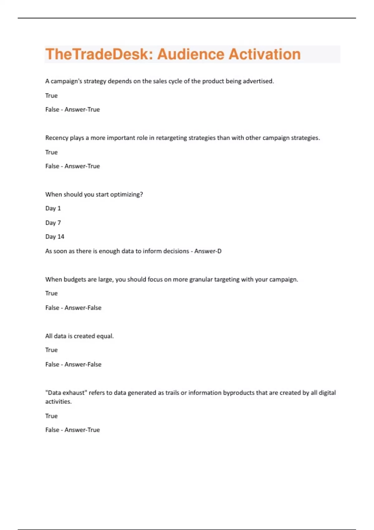 A campaign's strategy depends on the sales cycle of the product being advertised. True False - Answer-True Recency plays a more important role in retargeting strategies than with other campaign strategies. True False - Answer-True When should you start optimizing? Day 1 Day 7 Day 14 As soon as there is enough data to inform decisions - Answer-D When budgets are large, you should focus on more granular targeting with your campaign. True False - Answer-False All data is created equal. True False - Answer-False "Data exhaust" refers to data generated as trails or information byproducts that are created by all digital activities. True False - Answer-TrueYou must keep testing and optimizing your data throughout a campaign to see the greatest results. True False - Answer-True Which of the following questions should you ask when leveraging data? How was the data collected? What action was taken to qualify? How often is the data refreshed? Who supplied the data? All apply - Answer-E Which of the following metrics is most important when it comes to quality versus scale in data? 3x 1x 6x None apply - Answer-A A data management platform (DMP) allows you to convert first-party data into prospecting data. True False - Answer-True You have the ability to exclude or target audience data in a DMP. True False - Answer-True Which of the following is a use case for a DMP? Browsing for segments that fit campaign needs Forecasting Lookalike modelingAll apply - Answer-D Which of the below is NOT an ingredient for quality location data: User location Geo fencing Tying the right user to the right place Places data - Answer-B