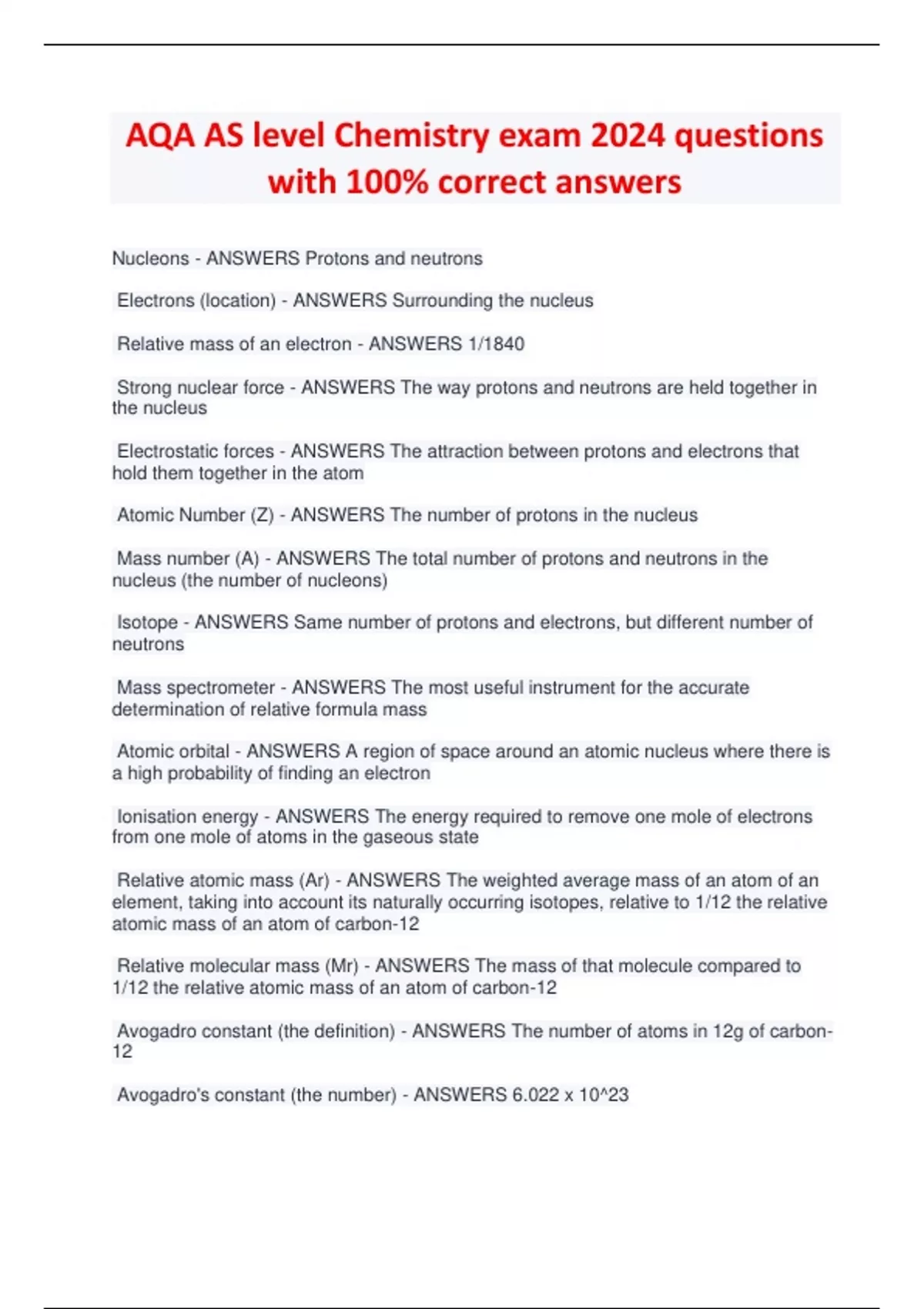 AQA AS level Chemistry exam 2024 questions with 100% correct answers Nucleons - ANSWERS Protons and neutrons Electrons (location) - ANSWERS Surrounding the nucleus Relative mass of an electron - ANSWERS 1/1840 Strong nuclear force - ANSWERS The way protons and neutrons are held together in the nucleus Electrostatic forces - ANSWERS The attraction between protons and electrons that hold them together in the atom Atomic Number (Z) - ANSWERS The number of protons in the nucleus Mass number (A) - ANSWERS The total number of protons and neutrons in the nucleus (the number of nucleons) Isotope - ANSWERS Same number of protons and electrons, but different number of neutrons Mass spectrometer - ANSWERS The most useful instrument for the accurate determination of relative formula mass Atomic orbital - ANSWERS A region of space around an atomic nucleus where there is a high probability of finding an electron Ionisation energy - ANSWERS The energy required to remove one mole of electrons from one mole of atoms in the gaseous state Relative atomic mass (Ar) - ANSWERS The weighted average mass of an atom of an element, taking into account its naturally occurring isotopes, relative to 1/12 the relative atomic mass of an atom of carbon-12 Relative molecular mass (Mr) - ANSWERS The mass of that molecule compared to 1/12 the relative atomic mass of an atom of carbon-12 Avogadro constant (the definition) - ANSWERS The number of atoms in 12g of carbon12 Avogadro's constant (the number) - ANSWERS 6.022 x 10^23 A mole - ANSWERS The amount of substance that contains 6.022x10^23 particles Ideal gas equation - ANSWERS PV=nRT Empirical formula - ANSWERS The formula that represents the simplest whole number ratio of the atoms of each element in a compound Molecular formula - ANSWERS the formula that gives the actual number of atoms of each element in one molecule of a compound Stoichiometry - ANSWERS The simple whole number ratios in which chemical species react Spectator ions - ANSWERS Ions that are unchanged during a chemical reaction, that is, they do not take part in the reaction Atom economy - ANSWERS Describes the efficiency of a chemical reaction by comparing the total number of atoms in the product with the total number of atoms in the starting materials Percentage yield - ANSWERS The practical efficiency of the process Ionic bonding - ANSWERS A chemical bond between metals and non-metals where electrons are transferred from the metal to the non-metal to form 2 oppositely charged ions that form electrostatic forces between them Covalent bonding - ANSWERS A chemical bond between non-metal atoms where a pair of electrons is shared Lattice - ANSWERS A regular 3D arrangement of atoms, ions or molecules Co-ordinate bond - ANSWERS Where both electrons come from one of the atoms in a covalent bond Dative covalent bond - ANSWERS Where both electrons come from one of the atoms in a covalent bond Lone pair - ANSWERS A pair of electrons in the outer shell of an electron that isn't involved in a bond Metallic bonding - ANSWERS A chemical bond between metals where outer electrons are delocalised within the lattice of metal ions Electronegativity - ANSWERS The power of an atom to attract the electron density in a covalent bond towards itself Electron density - ANSWERS The probability of electrons being found in a particular volume of space Polarity - ANSWERS The unequal sharing of the electrons between atoms in a covalent bond Polar - ANSWERS Describes a molecule where the charge is not equally distributed, one end is more positive, the other more negative Dipole-dipole forces - ANSWERS An intermolecular force between two molecules with permanent dipoles van der Waals forces - ANSWERS An intermolecular force between all atoms and molecules caused by instantaneous dipoles which form very weak electrostatic attractions Hydrogen bonding - ANSWERS An