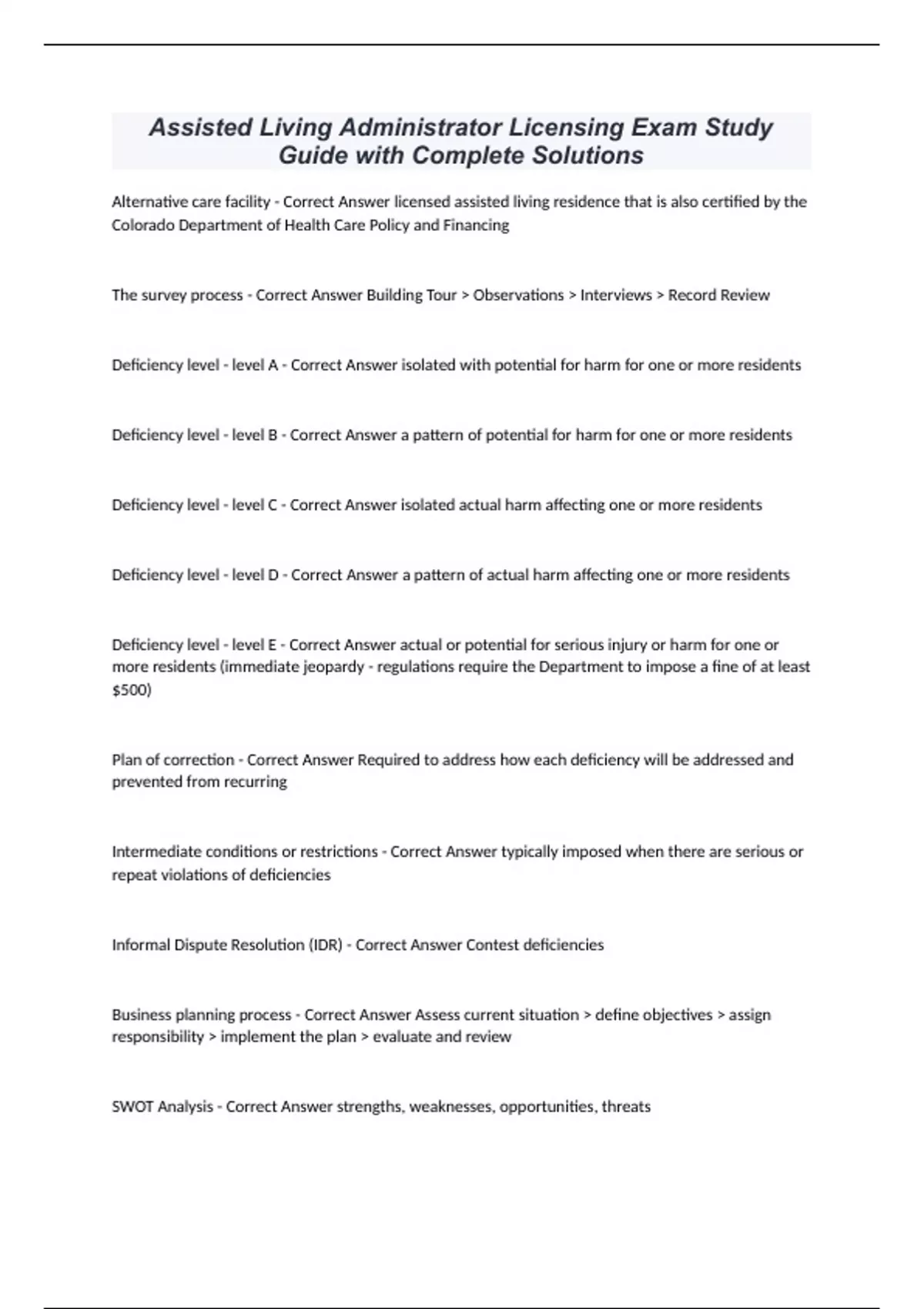 Assisted Living Administrator Licensing Exam Study Guide with Complete Solutions