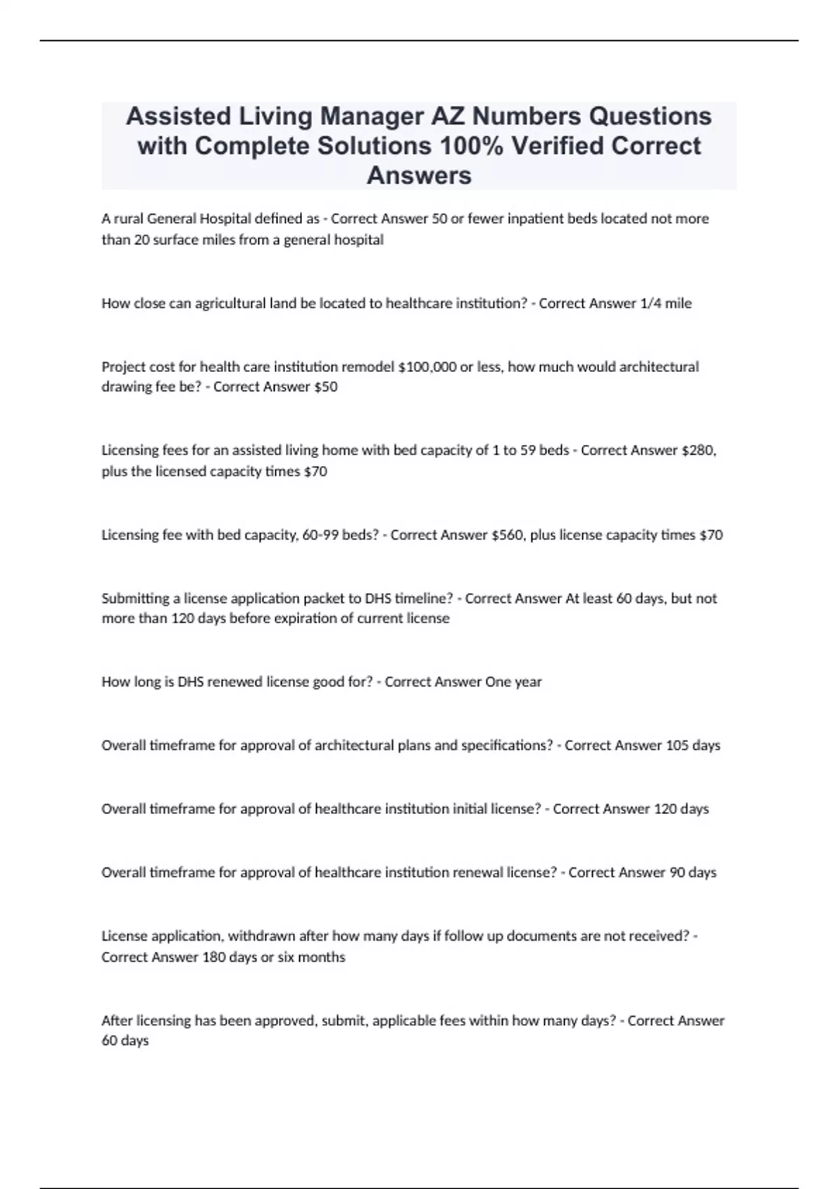 Assisted Living Manager AZ Numbers Questions with Complete Solutions 100% Verified Correct Answers A rural General Hospital defined as - Correct Answer 50 or fewer inpatient beds located not more than 20 surface miles from a general hospital How close can agricultural land be located to healthcare institution? - Correct Answer 1/4 mile Project cost for health care institution remodel $100,000 or less, how much would architectural drawing fee be? - Correct Answer $50 Licensing fees for an assisted living home with bed capacity of 1 to 59 beds - Correct Answer $280, plus the licensed capacity times $70 Licensing fee with bed capacity, 60-99 beds? - Correct Answer $560, plus license capacity times $70 Submitting a license application packet to DHS timeline? - Correct Answer At least 60 days, but not more than 120 days before expiration of current license How long is DHS renewed license good for? - Correct Answer One year Overall timeframe for approval of architectural plans and specifications? - Correct Answer 105 days Overall timeframe for approval of healthcare institution initial license? - Correct Answer 120 days Overall timeframe for approval of healthcare institution renewal license? - Correct Answer 90 days License application, withdrawn after how many days if follow up documents are not received? - Correct Answer 180 days or six months After licensing has been approved, submit, applicable fees within how many days? - Correct Answer 60 days If license denied, how many days to file a written appeal? - Correct Answer 30 days Any change of licensee, DHS should be notified within how many days? - Correct Answer 30 days Termination of health care, institution operations, notify DHS within how many days? - Correct Answer 30 days Employee documented TB test must be done how soon prior to employment? - Correct Answer Within 12 months How often should a behavioral health technician receive clinical oversight? - Correct Answer Once during a two week period For a behavioral health patient how often should their treatment plan be reviewed and updated? - Correct Answer Every 12 months If a patient's death is related to opioid, prescribed or ordered as part of treatment, how many working days after should DHS be notified? - Correct Answer One day To obtain managers initial certificate, how many paid work hours are required in the previous five years - Correct Answer 2080 hours