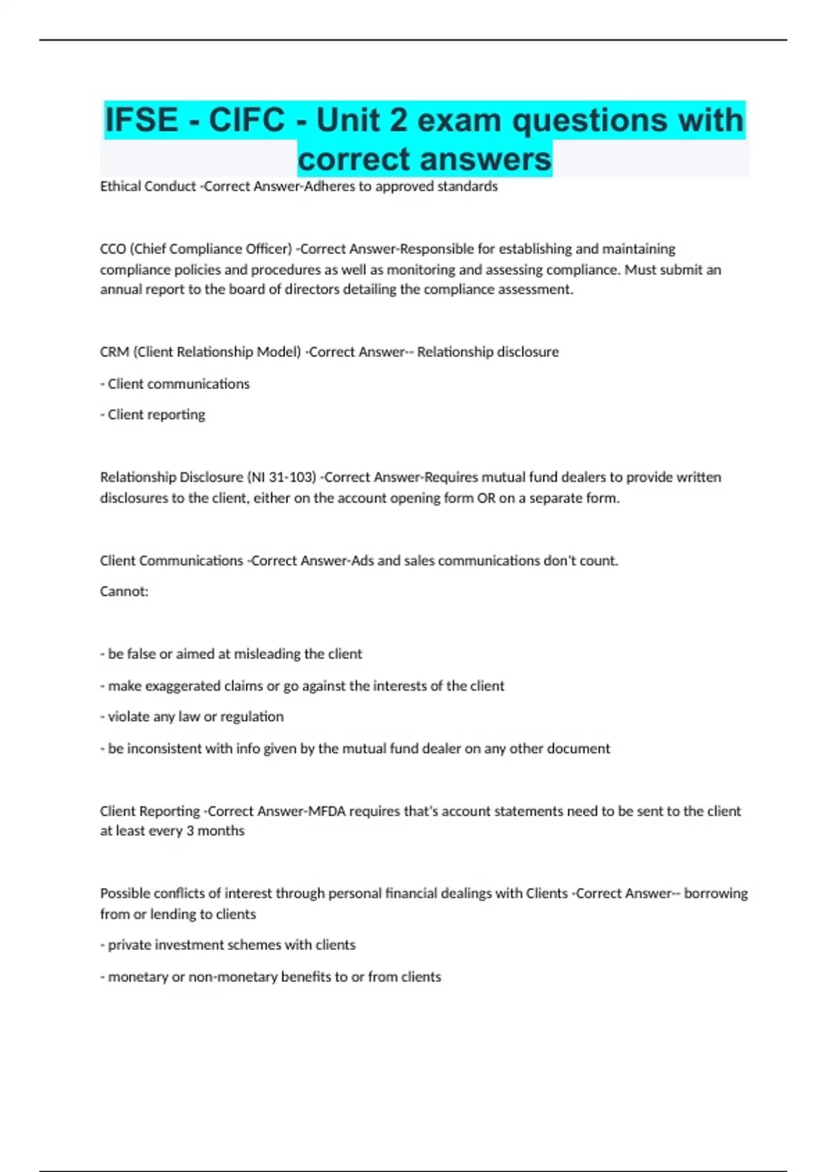 IFSE - CIFC - Unit 2 exam questions with correct answers Ethical Conduct -Correct Answer-Adheres to approved standards CCO (Chief Compliance Officer) -Correct Answer-Responsible for establishing and maintaining compliance policies and procedures as well as monitoring and assessing compliance. Must submit an annual report to the board of directors detailing the compliance assessment. CRM (Client Relationship Model) -Correct Answer-- Relationship disclosure - Client communications - Client reporting Relationship Disclosure (NI 31-103) -Correct Answer-Requires mutual fund dealers to provide written disclosures to the client, either on the account opening form OR on a separate form. Client Communications -Correct Answer-Ads and sales communications don't count. Cannot: - be false or aimed at misleading the client - make exaggerated claims or go against the interests of the client - violate any law or regulation - be inconsistent with info given by the mutual fund dealer on any other document Client Reporting -Correct Answer-MFDA requires that's account statements need to be sent to the client at least every 3 months Possible conflicts of interest through personal financial dealings with Clients -Correct Answer-- borrowing from or lending to clients - private investment schemes with clients - monetary or non-monetary benefits to or from clients - outside business activities Limited POA -Correct Answer-Restricts permitted actions to those if a specific nature such as financial matters General POA -