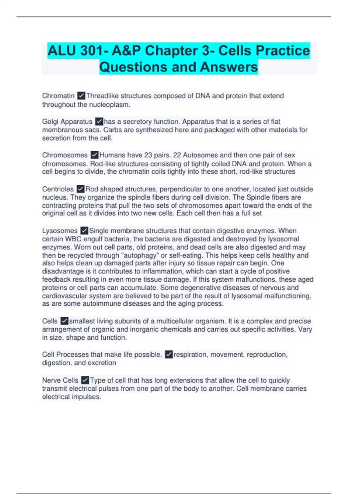ALU 301- A&P Chapter 3- Cells Practice Questions and Answers
