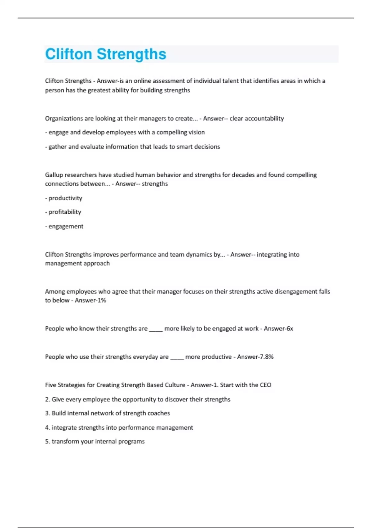 Clifton Strengths - Answer-is an online assessment of individual talent that identifies areas in which a person has the greatest ability for building strengths Organizations are looking at their managers to create... - Answer-- clear accountability - engage and develop employees with a compelling vision - gather and evaluate information that leads to smart decisions Gallup researchers have studied human behavior and strengths for decades and found compelling connections between... - Answer-- strengths - productivity - profitability - engagement Clifton Strengths improves performance and team dynamics by... - Answer-- integrating into management approach Among employees who agree that their manager focuses on their strengths active disengagement falls to below - Answer-1% People who know their strengths are ____ more likely to be engaged at work - Answer-6x People who use their strengths everyday are ____ more productive - Answer-7.8% Five Strategies for Creating Strength Based Culture - Answer-1. Start with the CEO 2. Give every employee the opportunity to discover their strengths 3. Build internal network of strength coaches 4. integrate strengths into performance management 5. transform your internal programsStart with the CEO - Answer-leadership involvement is what aligns strengths to the culture of the organization - articulate how the strengths initiative is connected to the organization's identity - create partnerships with other leaders using strengths - infuse strengths into their leadership brand Give every employee the opportunity to discover their strengths - Answer-- provide a team with a common language - ongoing plan to incorporate new team members - leverage strengths daily Build an internal network of strengths coaches - Answer-- focus on managers depth of understanding strengths - identify coaches whoa re highly credible and influential partners integrate strengths into performance management - Answer-bosses -> coaches - effective ongoing conversations that lead to performance management transform internal programs - Answer-audit existing programs and practices (entire employee life cycle) - understand employee experience - strengths oriented mindset what are the four Strengths strategies? - Answer-Push Pull Top-Down Grassroot Push Strengths Strategy - Answer-give access to all employees at once, infuse strengths into onboarding for all teams. Offer common language and adoption into the organizational culture.Pull Strengths Strategy - Answer-One division or team in the organization as a proving ground. Introduce strengths based on interest Top-Down Strategy - Answer-start with executive coaching and leadership team sessions. Have managers cascade strengths to teams across the organization creating broad-based support. Grassroot Strength Strategy - Answer-support the individual discovery and interest in CliftonStrengths by offing one-one-one coaching to introduce strengths as a coaching too Clifton strengths coaches - Answer-Trained professionals who spearhead organizational strengths initiatives. Fully qualified to provide strengths based coaching to individuals, teams and managers. Benefits of earning the gallup certified strengths coach designation - Answer-Value Impact Help people live their best life Help people be the best version of themselves Not just personal impact but business impact as well Education Participating in a course with experts Gain confidence in your work Certification Carrying the gallup brand name credentials to show your credibility Packages for Clifton Strengths - Answer-Gallup Access Clifton Strengths subscription (and CliftonStrengths 34 codes) Group learning experience to introduce Clifton Strengths -> Example: clifton strengths discovery half day/full day Follow-up one on one coaching for all employees Gallup coachesInternal gallup certified strengths coaches via gallup global strengths coach course Five things to know about Clifton Strengths - Answer-1. 50 years of research 2. measures the presences of 34 themes 3. designed to help you develop talents into strengths 4. gives language to talk about your talents with others 5. helps people identify their unique contributions