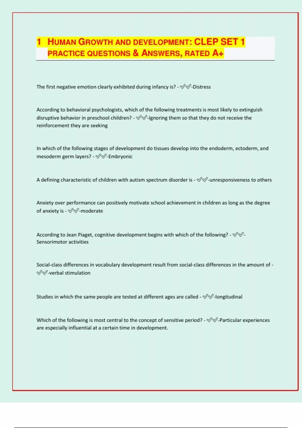 HUMAN GROWTH AND DEVELOPMENT: CLEP SET 1 PRACTICE QUESTIONS & ANSWERS, RATED A+ The first negative emotion clearly exhibited during infancy is? - -Distress According to behavioral psychologists, which of the following treatments is most likely to extinguish disruptive behavior in preschool children? - -Ignoring them so that they do not receive the reinforcement they are seeking In which of the following stages of development do tissues develop into the endoderm, ectoderm, and mesoderm germ layers? - -Embryonic A defining characteristic of children with autism spectrum disorder is - -unresponsiveness to others Anxiety over performance can positively motivate school achievement in children as long as the degree of anxiety is - -moderate According to Jean Piaget, cognitive development begins with which of the following? - - Sensorimotor activities Social-class differences in vocabulary development result from social-class differences in the amount of - -verbal stimulation Studies in which the same people are tested at different ages are called - -longitudinal Which of the following is most central to the concept of sensitive period? - -Particular experiences are especially influential at a certain time in