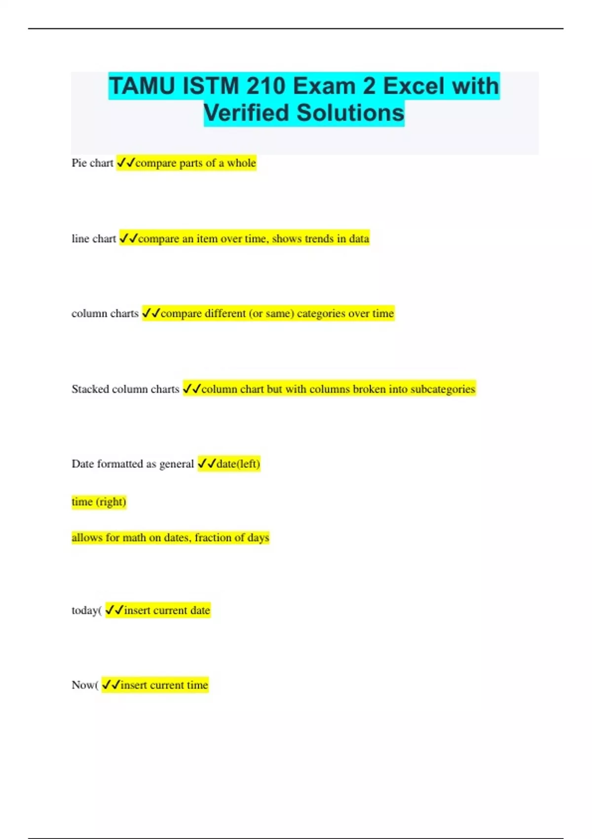 TAMU ISTM 210 Exam 2 Excel with Verified Solutions Pie chart compare parts of a whole line chart compare an item over time, shows trends in data column charts compare different (or same) categories over time Stacked column charts column chart but with columns broken into subcategories Date formatted as general date(left) time (right) allows for math on dates, fraction of days today( insert current date Now( insert current time Weekday( day of the week weeknum( week of the year month( month of the year year( what year hour( pull out hour Minute( pull out minute Seconds( pull out seconds Text in excel text for users excel is string of characters len( how many characters in a cell including all symbols and spaces Search( find words/ phrases or characters in cells left( # characters starting from the left right( # characters starting from right` mid( # characters between specified points upper( upper case everything lower( lower case everything