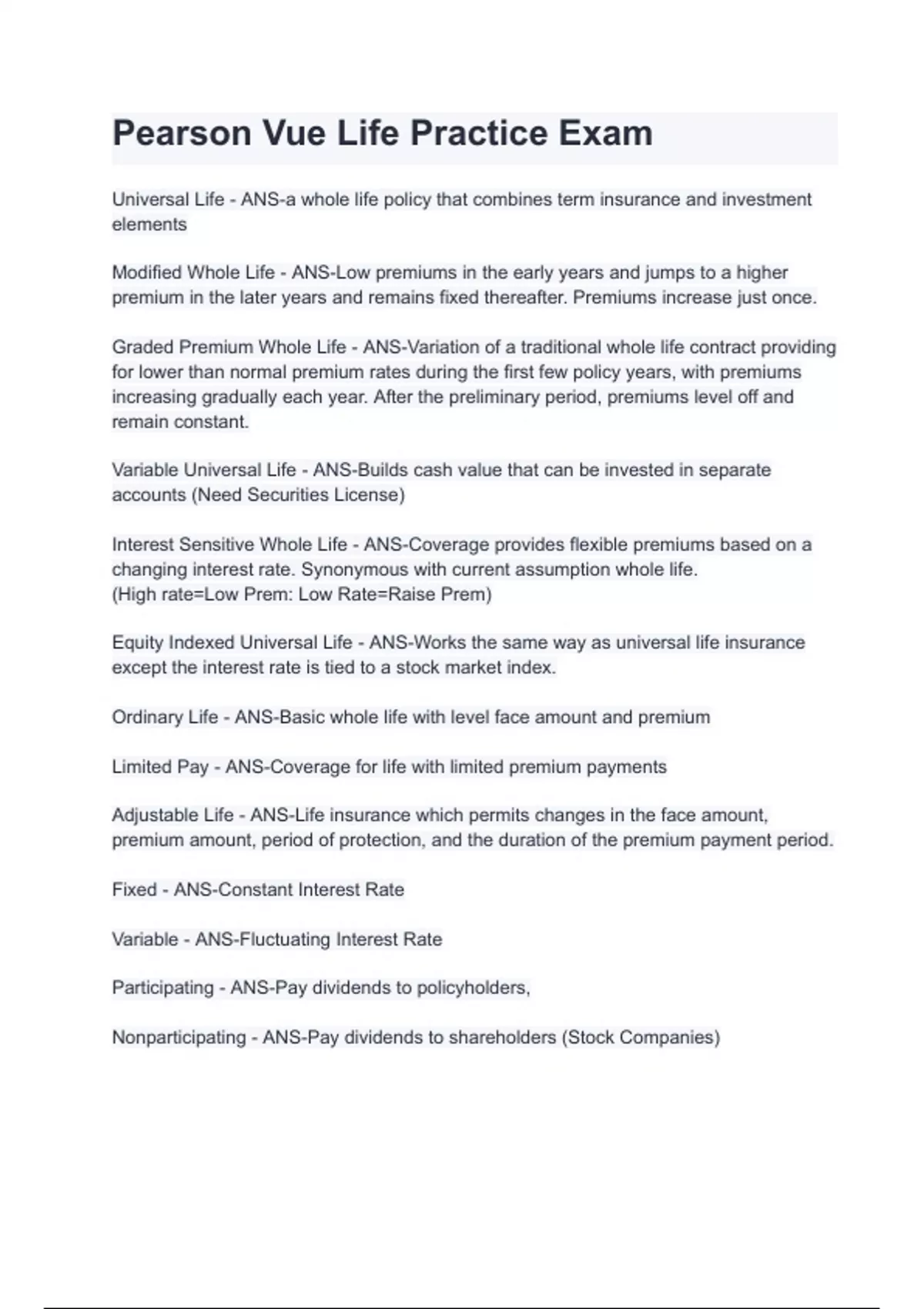 Pearson Vue Life Practice Exam. with 100% correct answers
