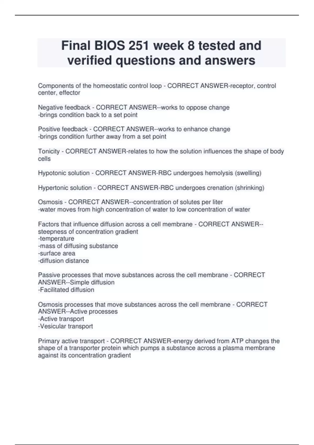 Final BIOS 251 week 8 tested and verified questions and answers Components of the homeostatic control loop - CORRECT ANSWER-receptor, control center, effector Negative feedback - CORRECT ANSWER--works to oppose change -brings condition back to a set point Positive feedback - CORRECT ANSWER--works to enhance change -brings condition further away from a set point Tonicity - CORRECT ANSWER-relates to how the solution influences the shape of body cells Hypotonic solution - CORRECT ANSWER-RBC undergoes hemolysis (swelling) Hypertonic solution - CORRECT ANSWER-RBC undergoes crenation (shrinking) Osmosis - CORRECT ANSWER--concentration of solutes per liter -water moves from high concentration of water to low concentration of water Factors that influence diffusion across a cell membrane - CORRECT ANSWER-- steepness of concentration gradient -temperature -mass of diffusing substance -surface area -diffusion distance Passive processes that move substances across the cell membrane - CORRECT ANSWER--Simple diffusion -Facilitated diffusion Osmosis processes that move substances across the cell membrane - CORRECT ANSWER--Active processes -Active transport -Vesicular transpor