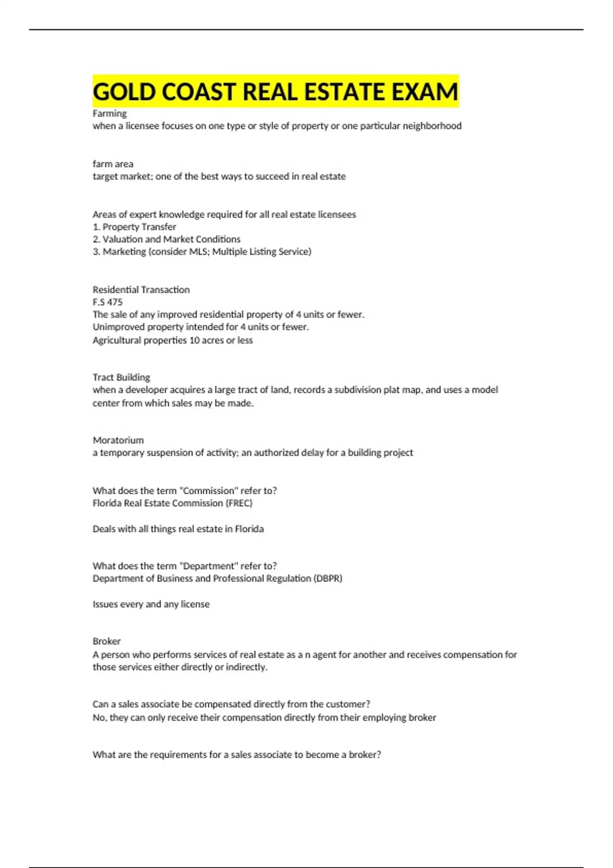 GOLD COAST REAL ESTATE EXAM Farming when a licensee focuses on one type or style of property or one particular neighborhood farm area target market; one of the best ways to succeed in real estate Areas of expert knowledge required for all real estate licensees 1. Property Transfer 2. Valuation and Market Conditions 3. Marketing (consider MLS; Multiple Listing Service) Residential Transaction F.S 475 The sale of any improved residential property of 4 units or fewer. Unimproved property intended for 4 units or fewer. Agricultural properties 10 acres or less Tract Building when a developer acquires a large tract of land, records a subdivision plat map, and uses a model center from which sales may be made. Moratorium a temporary suspension of activity; an authorized delay for a building project What does the term "Commission" refer to? Florida Real Estate Commission (FREC) Deals with all things real estate in Florida What does the term "Department" refer to? Department of Business and Professional Regulation (DBPR) Issues every and any license Broker A person who performs services of real estate as a n agent for another and receives compensation for those services either directly or indirectly. Can a sales associate be compensated directly from the customer? No, they can only receive their compensation directly from their employing broker What are the requirements for a sales associate to become a broker? The sales associate must have been employed under one or more actively licensed brokers for at least 24 months within the preceding 5 years before becoming eligible to take broker examination (licensure under an owner-developer does not satisfy this requirement) Broker Associate An individual who is qualified to be issued a broker's license but who operates as a sales associate in the employ of another broker. Glorified sales associate. Does an applicant for the Florida Real Estate license have to be a resident of the state or country? No [F.S. 455. 10] What is the first question in the application for the Sales Associate license? "Have you ever been convicted or found guilty of, or entered a plea of solo contenders (no contest) or guilty, regardless of adjudication, a crime in any jurisdiction, or are you currently under criminal investigation?" Is a DUI a major traffic offense? Yes, and it must be disclosed upon application What are the four parts of application denial? 1. Application is denied by the DEPARTMENT (DBPR) 2. You are notified in writing 3. You have 21 days from day of receipt 4. to request a formal hearing from an administrative law judge How many hours of a FREC I course must one complete in order to take state exam? 63 hours including the final examination How many hours of a FREC II course must a sales associate complete in order to be eligible to become a broker? 72 hours including end-of-course examination Can a sales associate work for more than one broker or developer at a time? No Does an owner-developer receive a real estate license upon registering with the department? No Sales associate first renewal Sales associate must complete a 45 hour post license course prior to the expiration of their initial license period. Failure to complete this requirement will result in licensee being out of business and void. Continuing Education (CE) All licensees, active or inactive, must complete 14 hours of commission-approved CE and pay a renewal fee during each renewal period, excluding the first (post-license). If these requirements are not met, the licensee's license status will be changed to INVOLUNTARY INACTIVE. Attorneys-in-fact persons who are granted authority under a power of attorney to act for others in some capacity, such as signing a document. Can an unlicensed resident of an apartment receive compensation for referring a new tenant to their same apartment complex? Yes, they can receive up to $50 dollars, personal property, or credit toward rent for the referral of a new tenant in same apartment complex Power of the Department Department CAN seek out an injunction from a court against a licensee for failure to follow Department orders. Department CAN NOT issue injunctions against an unlicensed individual but may seek an injunction from the court FREC Exectutive Powers The executive powers can be excercised by the chairperson acting ALONE or can be delegated by quorum vote to any other Commission member. Violation of F.S. 475 Penalty 1. Reprimand (slap on the wrist) 2. Administrative fine of up to $5000 per offense 3. License suspension for up to 10 years 4. Total revocation What happens when a broker's license is suspended, revoked, or void/ineffective? The licenses of all persons who are employed under such broker become automatically inactive Who can cancel your real estate license? only YOU Group License A single real estate license that can be obtained if the sales associate or broker associate works for one owner-developer with affiliated organizations, which provides real estate services in different geographic areas. Who can have multiple licenses? only the broker, they must show that the licenses are necessary for legitimate business reasons Do administrative agencies have the authority to levy monetary fines for laws they have administered? Yes Special Agent Single agency. Authorized under agency law by the employer to perform a SINGLE act. subagent a subagency is not a type of agency, rather an extension of another agency a party who has been granted authority to act on behalf of another agent a subagent has the same duties to the principal as the agent who was empowered by the principal A sales associate is a subagent to the broker they work for What are the 4 terms that connect to single agency? 1. Special Agent 2. Represents 3. Fiduciary 4. Principal If the word principal comes up in a question with LIMITED REPRESENTATION, then... make sure your answer is transaction broker as opposed to single agency Single agent A broker who represents, as a fiduciary,