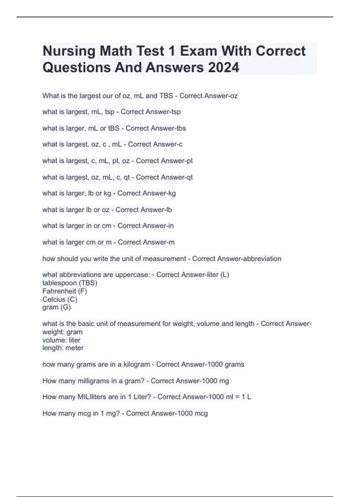 Nursing Math Test 1 Exam With Correct Questions And Answers 2024