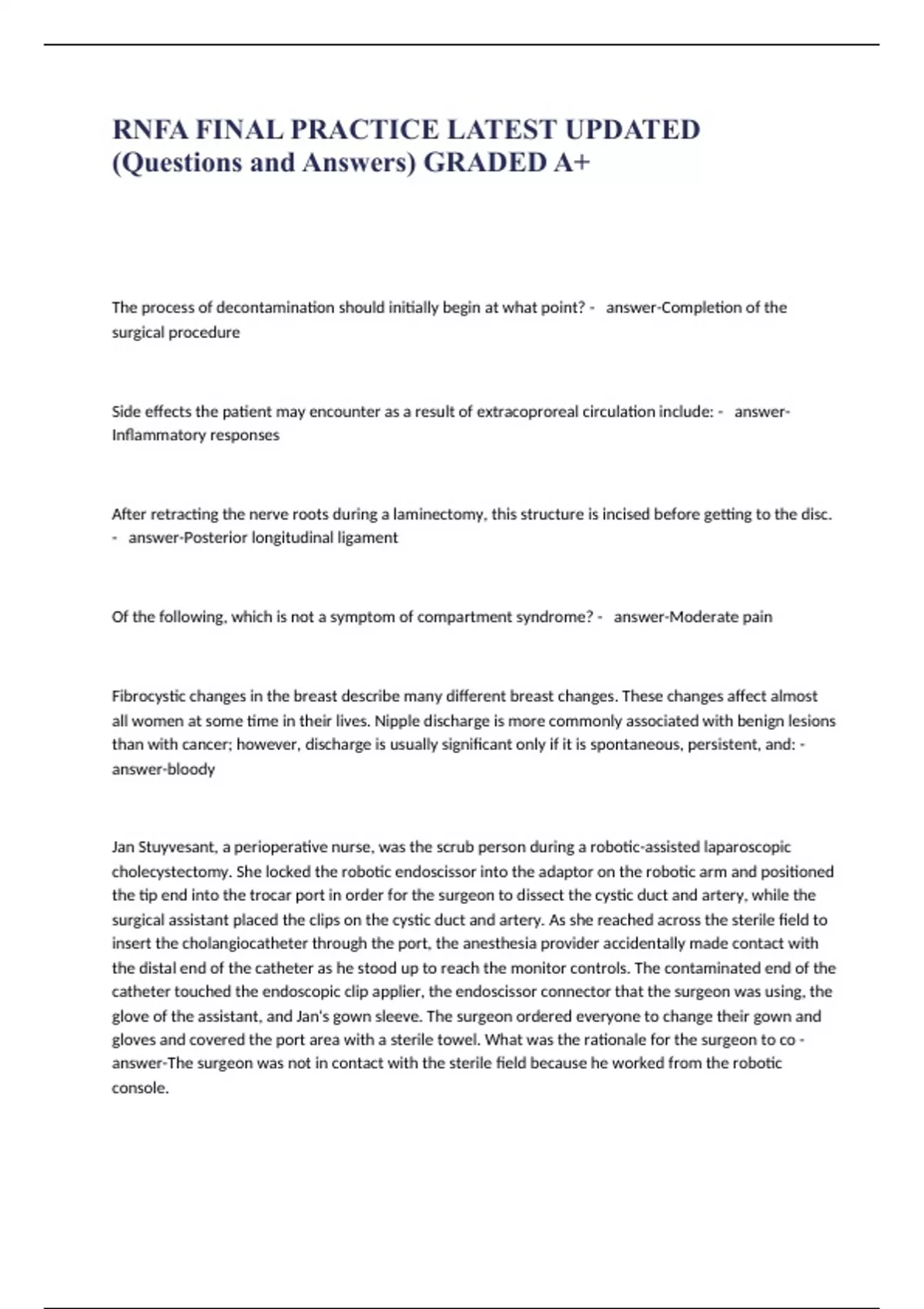 The process of decontamination should initially begin at what point? - answer-Completion of the surgical procedure Side effects the patient may encounter as a result of extracoproreal circulation include: - answer-Inflammatory responses After retracting the nerve roots during a laminectomy, this structure is incised before getting to the disc. - answer-Posterior longitudinal ligament Of the following, which is not a symptom of compartment syndrome? - answer-Moderate pain Fibrocystic changes in the breast describe many different breast changes. These changes affect almost all women at some time in their lives. Nipple discharge is more commonly associated with benign lesions than with cancer; however, discharge is usually significant only if it is spontaneous, persistent, and: - answer-bloody Jan Stuyvesant, a perioperative nurse, was the scrub person during a robotic-assisted laparoscopic cholecystectomy. She locked the robotic endoscissor into the adaptor on the robotic arm and positioned the tip end into the trocar port in order for the surgeon to dissect the cystic duct and artery, while the surgical assistant placed the clips on the cystic duct and artery. As she reached across the sterile field to insert the cholangiocatheter through the port, the anesthesia provider accidentally made contact with the distal end of the catheter as he stood up to reach the monitor controls. The contaminated end of the catheter touched the endoscopic clip applier, the endoscissor connector that the surgeon was using, the glove of the assistant, and Jan's gown sleeve. The surgeon ordered everyone to change their gown and gloves and covered the port area with a sterile towel. What was the rationale for the surgeon to co - answer-The surgeon was not in contact with the sterile field because he worked from the robotic console.