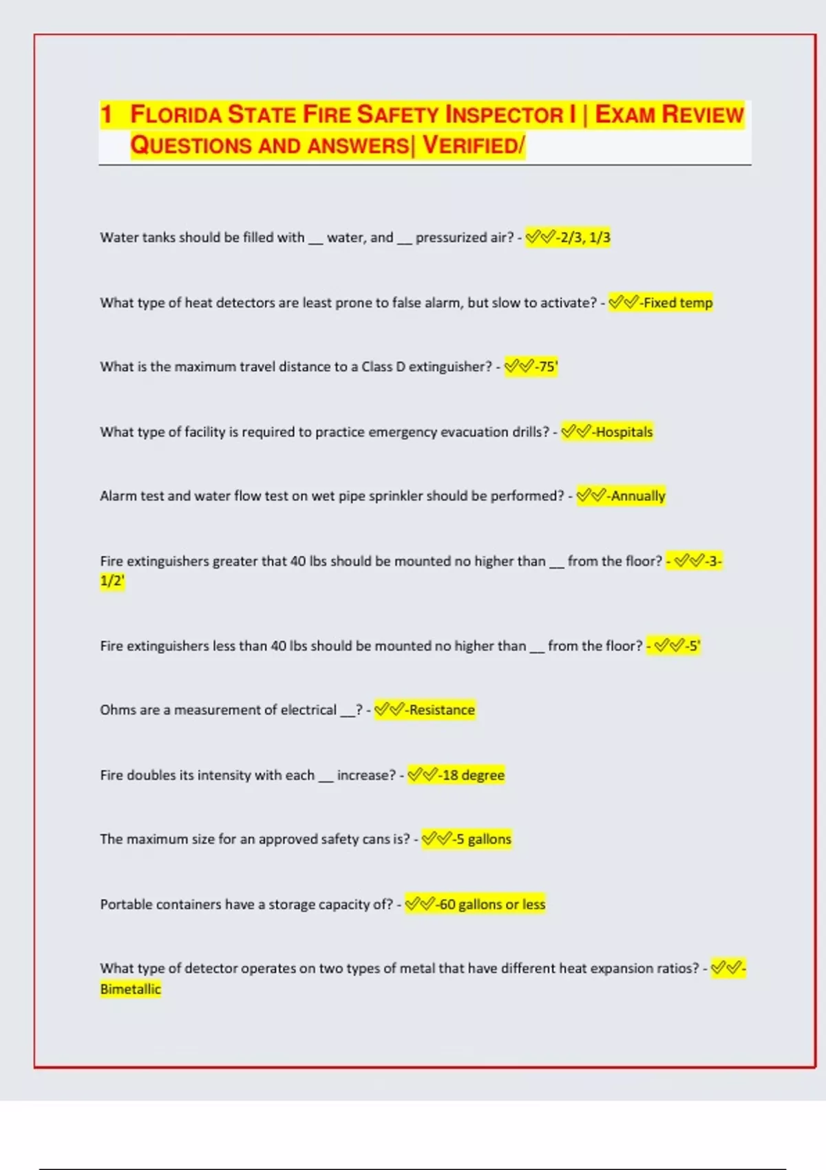 FLORIDA STATE FIRE SAFETY INSPECTOR I | EXAM REVIEW QUESTIONS AND ANSWERS| VERIFIED/ Water tanks should be filled with __ water, and __ pressurized air? - -2/3, 1/3 What type of heat detectors are least prone to false alarm, but slow to activate? - -Fixed temp What is the maximum travel distance to a Class D extinguisher? - -75' What type of facility is required to practice emergency evacuation drills? - -Hospitals Alarm test and water flow test on wet pipe sprinkler should be performed? - -Annually Fire extinguishers greater that 40 lbs should be mounted no higher than __ from the floor? - -3- 1/2' Fire extinguishers less than 40 lbs should be mounted no higher than __ from the floor? - -5' Ohms are a measurement of electrical __? - -Resistance Fire doubles its intensity with each __ increase? - -18 degree The maximum size for an approved safety cans is? - -5 gallons Portable containers have a storage capacity of?