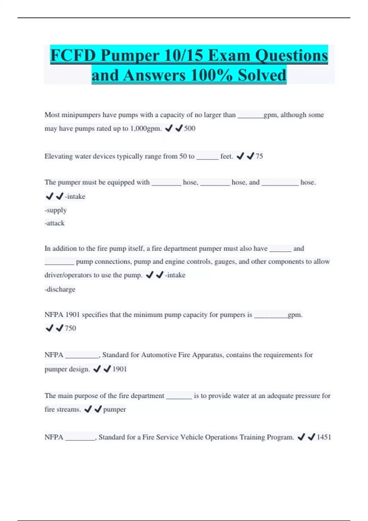 FCFD Pumper 10/15 Exam Questions and Answers 100% Solved Most minipumpers have pumps with a capacity of no larger than _______gpm, although some may have pumps rated up to 1,000gpm. ️️500 Elevating water devices typically range from 50 to ______ feet. ️️75 The pumper must be equipped with ________ hose, ________ hose, and __________ hose. ️️-intake -supply -attack In addition to the fire pump itself, a fire department pumper must also have ______ and ________ pump connections, pump and engine controls, gauges, and other components to allow driver/operators to use the pump. ️️-intake -discharge NFPA 1901 specifies that the minimum pump capacity for pumpers is _________gpm. ️️750