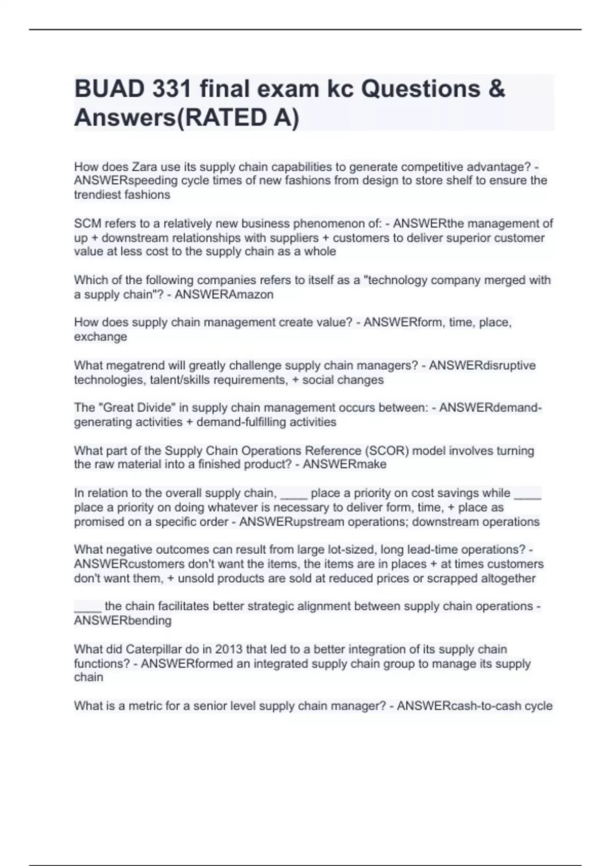 How does Zara use its supply chain capabilities to generate competitive advantage? - ANSWERspeeding cycle times of new fashions from design to store shelf to ensure the trendiest fashions SCM refers to a relatively new business phenomenon of: - ANSWERthe management of up + downstream relationships with suppliers + customers to deliver superior customer value at less cost to the supply chain as a whole Which of the following companies refers to itself as a "technology company merged with a supply chain"? - ANSWERAmazon How does supply chain management create value? - ANSWERform, time, place, exchange What megatrend will greatly challenge supply chain managers? - ANSWERdisruptive technologies, talent/skills requirements, + social changes The "Great Divide" in supply chain management occurs between: - ANSWERdemand-generating activities + demand-fulfilling activities What part of the Supply Chain Operations Reference (SCOR) model involves turning the raw material into a finished product? - ANSWERmake In relation to the overall supply chain, ____ place a priority on cost savings while ____ place a priority on doing whatever is necessary to deliver form, time, + place as promised on a specific order - ANSWERupstream operations; downstream operations What negative outcomes can result from large lot-sized, long lead-time operations? - ANSWERcustomers don't want the items, the items are in places + at times customers don't want them, + unsold products are sold at reduced prices or scrapped altogether ____ the chain facilitates better strategic alignment between supply chain operations - ANSWERbending What did Caterpillar do in 2013 that led to a better integration of its supply chain functions? - ANSWERformed an integrated supply chain group to manage its supply chain What is a metric for a senior level supply chain manager? - ANSWERcash-to-cash cycle What