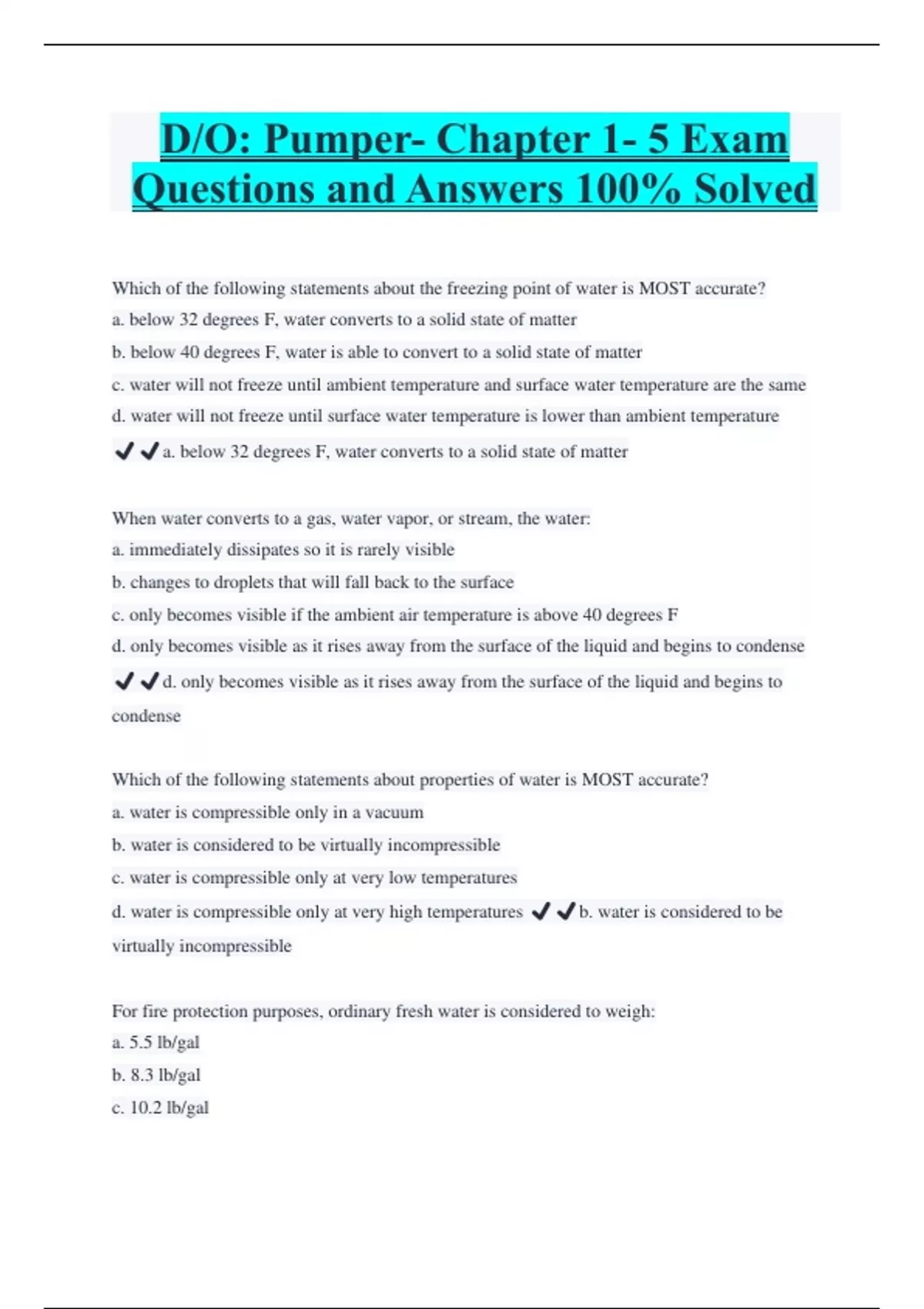 D/O: Pumper- Chapter 1- 5 Exam Questions and Answers 100% Solved Which of the following statements about the freezing point of water is MOST accurate? a. below 32 degrees F, water converts to a solid state of matter b. below 40 degrees F, water is able to convert to a solid state of matter c. water will not freeze until ambient temperature and surface water temperature are the same d. water will not freeze until surface water temperature is lower than ambient temperature ️️a. below 32 degrees F, water converts to a solid state of matter When water converts to a gas, water vapor, or stream, the water: a. immediately dissipates so it is rarely visible b. changes to droplets that will fall back to the surface c. only becomes visible if the ambient air temperature is above 40 degrees F d. only becomes visible as it rises away from the surface of the liquid and begins to condense ️️d. only becomes visible as it rises away from the surface of the liquid and begins to condense