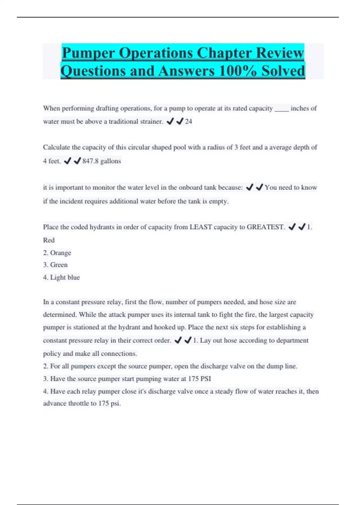 Pumper Operations Chapter Review Questions and Answers 100% Solved When performing drafting operations, for a pump to operate at its rated capacity ____ inches of water must be above a traditional strainer. ️️24 Calculate the capacity of this circular shaped pool with a radius of 3 feet and a average depth of 4 feet. ️️847.8 gallons it is important to monitor the water level in the onboard tank because: ️️You need to know if the incident requires additional water before the tank is empty. Place the coded hydrants in order of capacity from LEAST capacity to GREATEST. ️️1. Red 2. Orange 3. Green 4. Light blue