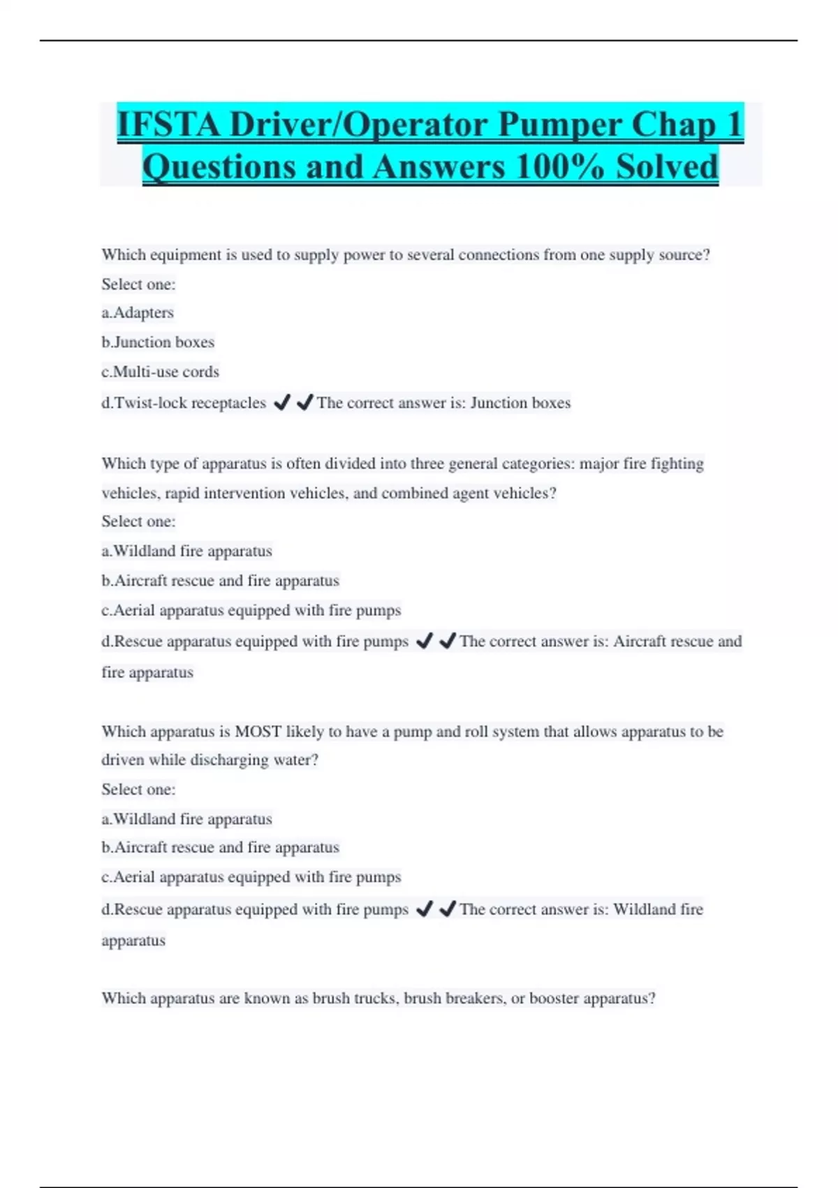 IFSTA Driver/Operator Pumper Chap 1 Questions and Answers 100% Solved Which equipment is used to supply power to several connections from one supply source? Select one: a.Adapters b.Junction boxes c.Multi-use cords d.Twist-lock receptacles ️️The correct answer is: Junction boxes Which type of apparatus is often divided into three general categories: major fire fighting vehicles, rapid intervention vehicles, and combined agent vehicles? Select one: a.Wildland fire apparatus b.Aircraft rescue and fire apparatus c.Aerial apparatus equipped with fire pumps d.Rescue apparatus equipped with fire pumps ️️The correct answer is: Aircraft rescue and fire apparatus