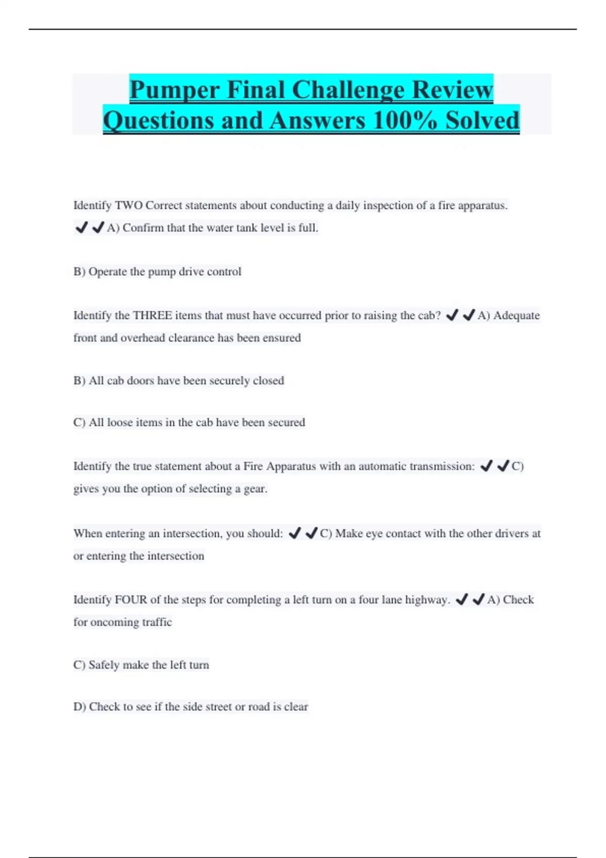Pumper Final Challenge Review Questions and Answers 100% Solved Identify TWO Correct statements about conducting a daily inspection of a fire apparatus. ️️A) Confirm that the water tank level is full. B) Operate the pump drive control Identify the THREE items that must have occurred prior to raising the cab? ️️A) Adequate front and overhead clearance has been ensured B) All cab doors have been securely closed C) All loose items in the cab have been secured Identify the true statement about a Fire Apparatus with an automatic transmission: ️️C) gives you the option of selecting a gear. When entering an intersection, you should: ️️C) Make eye contact with the other drivers at or entering the intersection