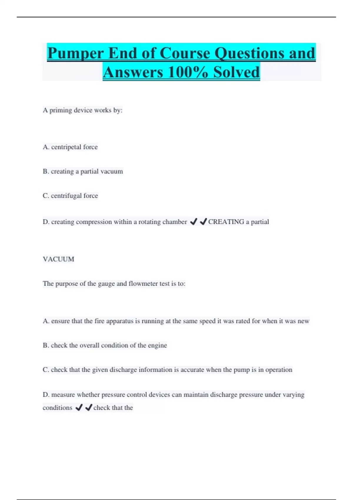 Pumper End of Course Questions and Answers 100% Solved A priming device works by: A. centripetal force B. creating a partial vacuum C. centrifugal force D. creating compression within a rotating chamber ️️CREATING a partial VACUUM The purpose of the gauge and flowmeter test is to: A. ensure that the fire apparatus is running at the same speed it was rated for when it was new B. check the overall condition of the engine C. check that the given discharge information is accurate when the pump is in operation D. measure whether pressure control devices can maintain discharge pressure under varying conditions ️️check that the