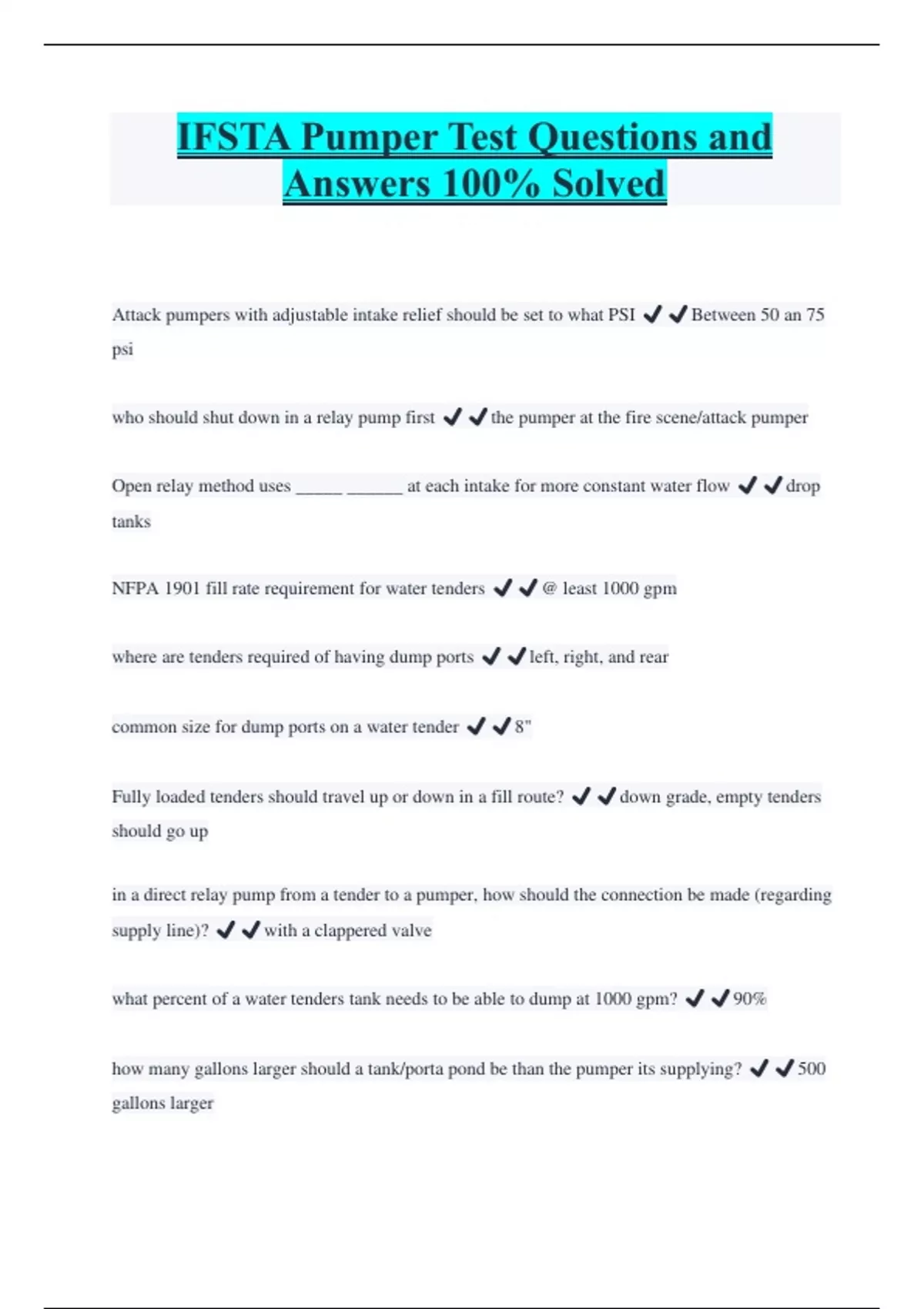 IFSTA Pumper Test Questions and Answers 100% Solved Attack pumpers with adjustable intake relief should be set to what PSI ️️Between 50 an 75 psi who should shut down in a relay pump first ️️the pumper at the fire scene/attack pumper Open relay method uses _____ ______ at each intake for more constant water flow ️️drop tanks NFPA 1901 fill rate requirement for water tenders ️️@ least 1000 gpm where are tenders required of having dump ports ️️left, right, and rear common size for dump ports on a water tender ️️8"