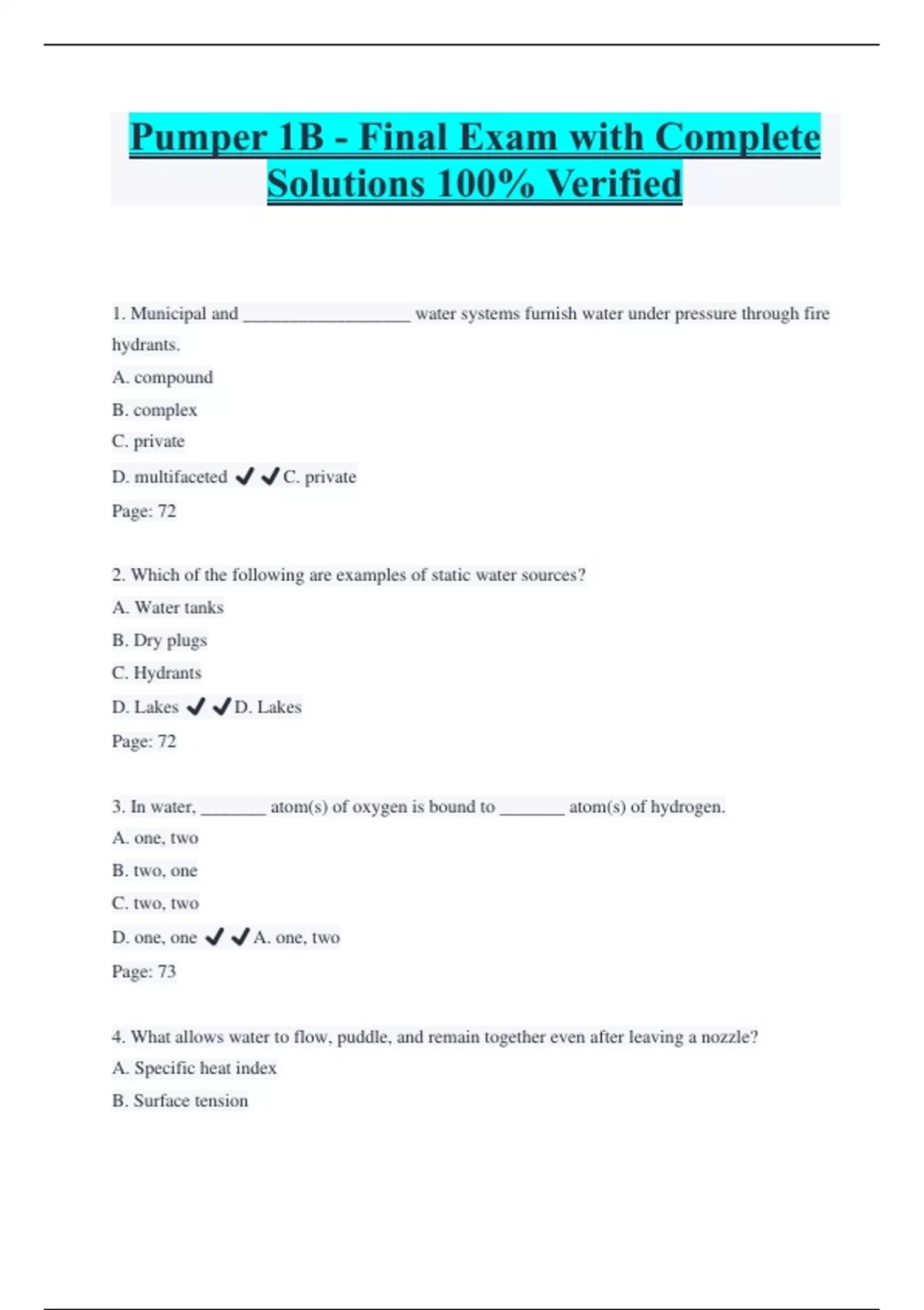Pumper 1B - Final Exam with Complete Solutions 100% Verified 1. Municipal and __________________ water systems furnish water under pressure through fire hydrants. A. compound B. complex C. private D. multifaceted ️️C. private Page: 72 2. Which of the following are examples of static water sources? A. Water tanks B. Dry plugs C. Hydrants D. Lakes ️️D. Lakes Page: 72 3. In water, _______ atom(s) of oxygen is bound to _______ atom(s) of hydrogen. A. one, two B. two, one C. two, two D. one, one ️️A. one, two Page: 73 4. What allows water to flow, puddle, and remain together even after leaving a nozzle? A. Specific heat index B. Surface tension