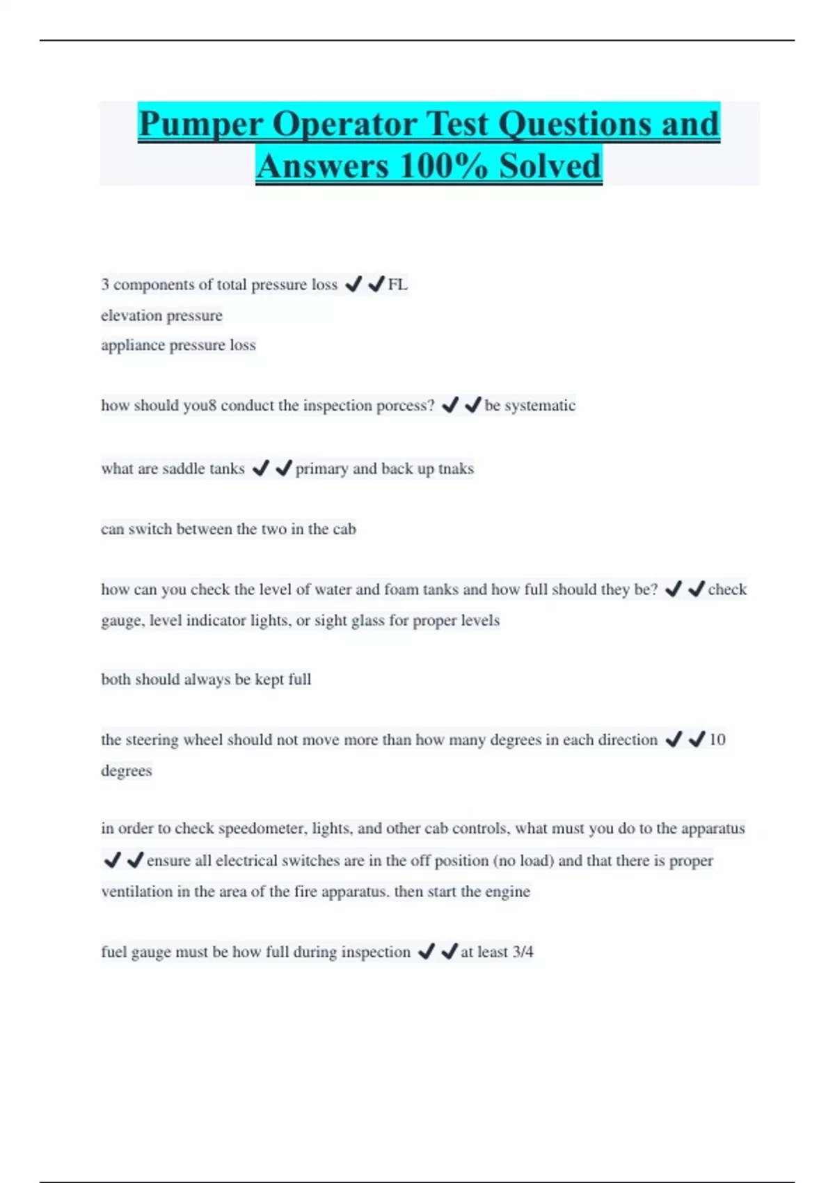 Pumper Operator Test Questions and Answers 100% Solved 3 components of total pressure loss ️️FL elevation pressure appliance pressure loss how should you8 conduct the inspection porcess? ️️be systematic what are saddle tanks ️️primary and back up tnaks can switch between the two in the cab how can you check the level of water and foam tanks and how full should they be? ️️check gauge, level indicator lights, or sight glass for proper levels both should always be kept full the steering wheel should not move more than how many degrees in each direction ️️10 degrees
