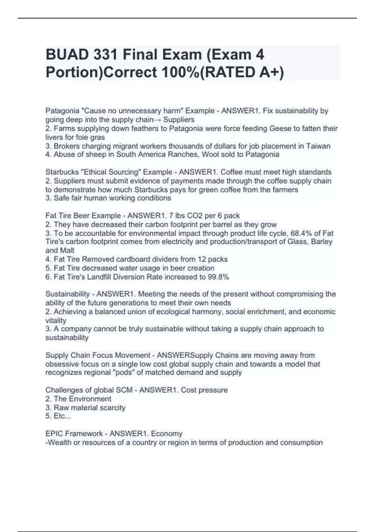 Patagonia "Cause no unnecessary harm" Example - ANSWER1. Fix sustainability by going deep into the supply chain→ Suppliers 2. Farms supplying down feathers to Patagonia were force feeding Geese to fatten their livers for foie gras 3. Brokers charging migrant workers thousands of dollars for job placement in Taiwan 4. Abuse of sheep in South America Ranches, Wool sold to Patagonia Starbucks "Ethical Sourcing" Example - ANSWER1. Coffee must meet high standards 2. Suppliers must submit evidence of payments made through the coffee supply chain to demonstrate how much Starbucks pays for green coffee from the farmers 3. Safe fair human working conditions Fat Tire Beer Example - ANSWER1. 7 lbs CO2 per 6 pack 2. They have decreased their carbon footprint per barrel as they grow 3. To be accountable for environmental impact through product life cycle, 68.4% of Fat Tire's carbon footprint comes from electricity and production/transport of Glass, Barley and Malt 4. Fat Tire Removed cardboard dividers from 12 packs 5. Fat Tire decreased water usage in beer creation 6. Fat Tire's Landfill Diversion Rate increased to 99.8% Sustainability - ANSWER1. Meeting the needs of the present without compromising the ability of the future generations to meet their own needs 2. Achieving a balanced union of ecological harmony, social enrichment, and economic vitality 3. A company cannot be truly sustainable without taking a supply chain approach to sustainability Supply Chain Focus Movement - ANSWERSupply Chains are moving away from obsessive focus on a single low cost global supply chain and towards a model that recognizes regional "pods" of matched demand and supply Challenges of global SCM - ANSWER1. Cost pressure 2. The Environment 3. Raw material scarcity 5. Etc... EPIC Framework - ANSWER1. Economy