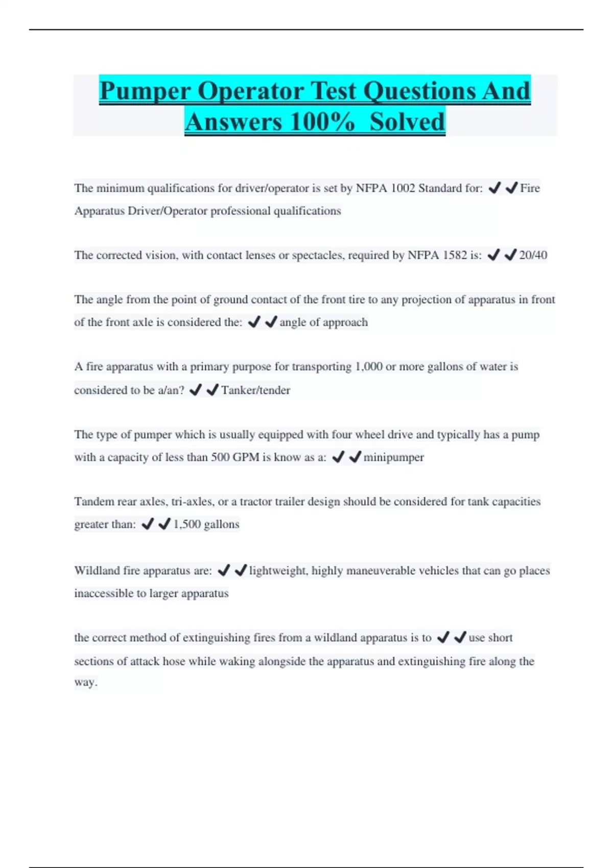 Pumper Operator Test Questions And Answers 100% Solved The minimum qualifications for driver/operator is set by NFPA 1002 Standard for: ️️Fire Apparatus Driver/Operator professional qualifications The corrected vision, with contact lenses or spectacles, required by NFPA 1582 is: ️️20/40 The angle from the point of ground contact of the front tire to any projection of apparatus in front of the front axle is considered the: ️️angle of approach A fire apparatus with a primary purpose for transporting 1,000 or more gallons of water is considered to be a/an? ️️Tanker/tender