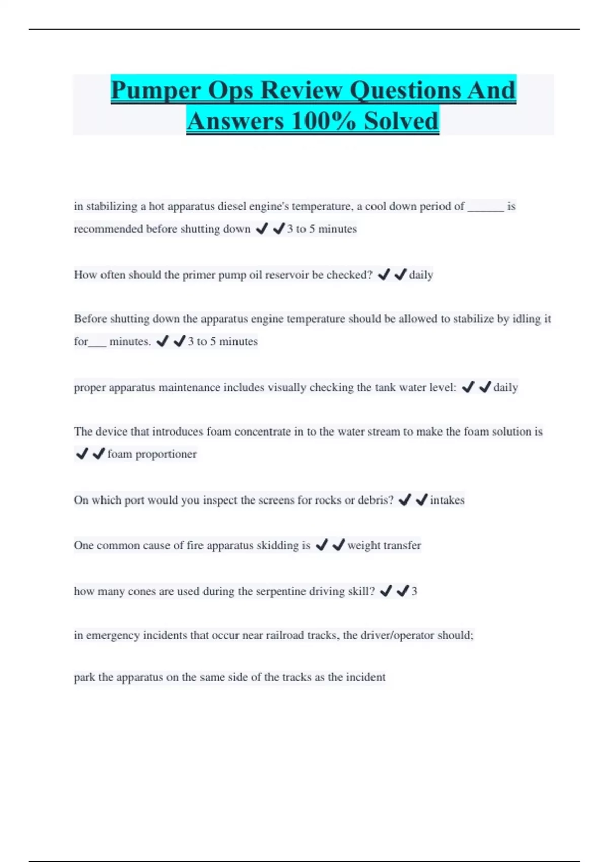 Pumper Ops Review Questions And Answers 100% Solved in stabilizing a hot apparatus diesel engine's temperature, a cool down period of ______ is recommended before shutting down ️️3 to 5 minutes How often should the primer pump oil reservoir be checked? ️️daily Before shutting down the apparatus engine temperature should be allowed to stabilize by idling it for___ minutes. ️️3 to 5 minutes proper apparatus maintenance includes visually checking the tank water level: ️️daily The device that introduces foam concentrate in to the water stream to make the foam solution is ️️foam proportioner On which port would you inspect the screens for rocks or debris? ️️intakes One common cause of fire apparatus skidding is ️️weight transfer how many cones are used during the serpentine driving skill? ️️3 in emergency incidents that occur near railroad tracks, the driver/operator should; park the apparatus on the same side of the tracks as the incident
