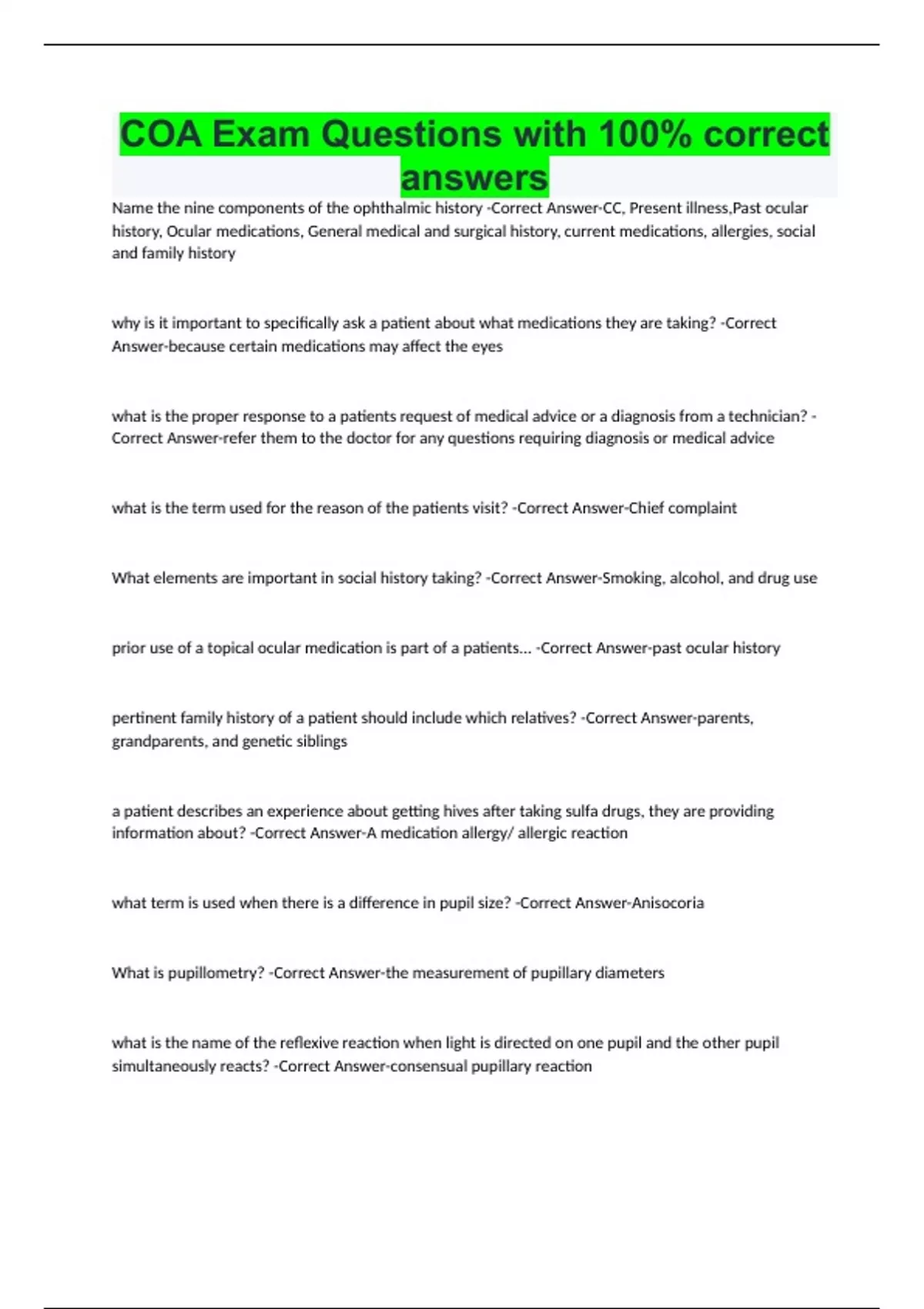 COA Exam Questions with 100% correct answers Name the nine components of the ophthalmic history -Correct Answer-CC, Present illness,Past ocular history, Ocular medications, General medical and surgical history, current medications, allergies, social and family history why is it important to specifically ask a patient about what medications they are taking? -Correct Answer-because certain medications may affect the eyes what is the proper response to a patients request of medical advice or a diagnosis from a technician? -Correct Answer-refer them to the doctor for any questions requiring diagnosis or medical advice what is the term used for the reason of the patients visit? -Correct Answer-Chief complaint What elements are important in social history taking? -Correct Answer-Smoking, alcohol, and drug use prior use of a topical ocular medication is part of a patients... -Correct Answer-past ocular history pertinent family history of a patient should include which relatives? -Correct Answer-parents, grandparents, and genetic siblings a patient describes an experience about getting hives after taking sulfa drugs, they are providing information about? -Correct Answer-A medication allergy/ allergic reaction what term is used when there is a difference in pupil size? -Correct Answer-Anisocoria What is pupillometry? -Correct Answer-the measurement of pupillary diameters what is the name of the reflexive reaction when light is directed on one pupil and the other pupil simultaneously reacts? -Correct Answer-consensual pupillary reaction what is the term for spasmodic, rhythmic dilating and contracting of pupils? -Correct Answer-Hippus what is the name of the test used for detecting a relative afferent pupillary defect? -Correct Answer-swinging flashlight test which muscle of the iris constricts in bright light? -Correct Answer-the sphincter what is pupil dilation called? -Correct Answer-mydriasis how is anterior chamber depth estimated using a slit lamp? -Correct Answer-the beam of light is placed at the limbus at 60degrees, and the distance between the post. limit and the anter. limit or the irish beam is compared with the thickness of the optical section of cornea. which two structures touch if the anterior chamber is flat? -Correct Answer-the iris and cornea