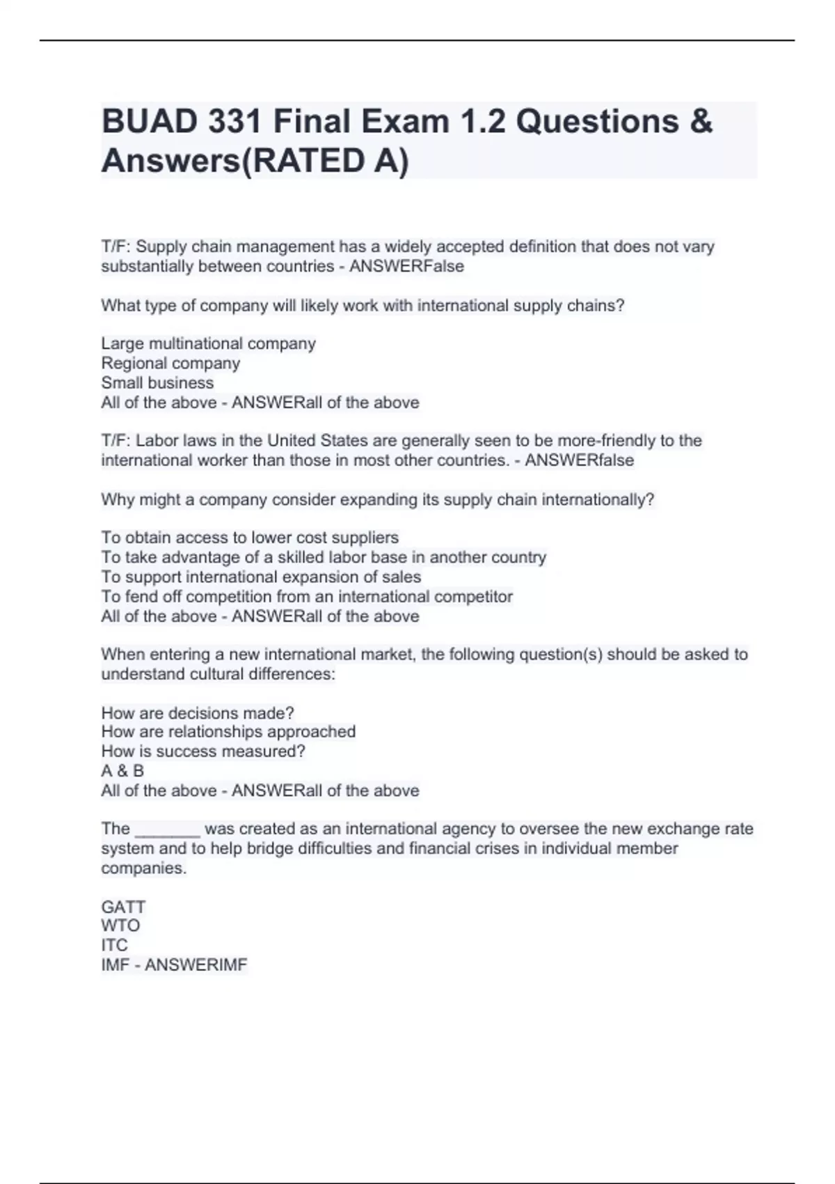 T/F: Supply chain management has a widely accepted definition that does not vary substantially between countries - ANSWERFalse What type of company will likely work with international supply chains? Large multinational company Regional company Small business All of the above - ANSWERall of the above T/F: Labor laws in the United States are generally seen to be more-friendly to the international worker than those in most other countries. - ANSWERfalse Why might a company consider expanding its supply chain internationally? To obtain access to lower cost suppliers To take advantage of a skilled labor base in another country To support international expansion of sales To fend off competition from an international competitor All of the above - ANSWERall of the above When entering a new international market, the following question(s) should be asked to understand cultural differences: How are decisions made? How are relationships approached How is success measured? A & B All of the above - ANSWERall of the above The _______ was created as an international agency to oversee the new exchange rate system and to help bridge difficulties and financial crises in individual member companies. GATT WTO ITC IMF - ANSWERIMF Two-thirds of the world's countries including France and Germany use what type of law as t
