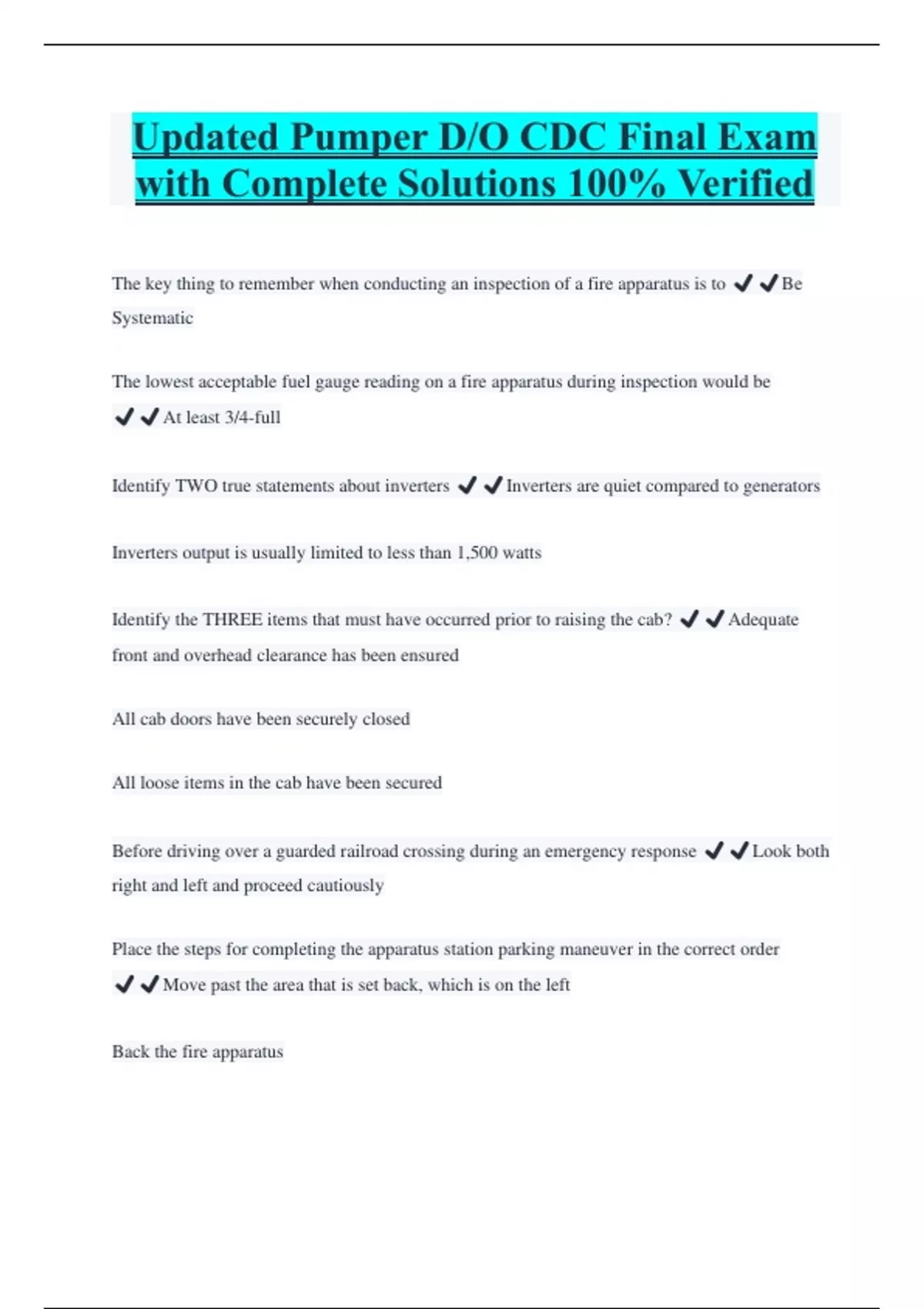 Updated Pumper D/O CDC Final Exam with Complete Solutions 100% Verified The key thing to remember when conducting an inspection of a fire apparatus is to ️️Be Systematic The lowest acceptable fuel gauge reading on a fire apparatus during inspection would be ️️At least 3/4-full Identify TWO true statements about inverters ️️Inverters are quiet compared to generators Inverters output is usually limited to less than 1,500 watts Identify the THREE items that must have occurred prior to raising the cab? ️️Adequate front and overhead clearance has been ensured All cab doors have been securely closed All loose items in the cab have been secured