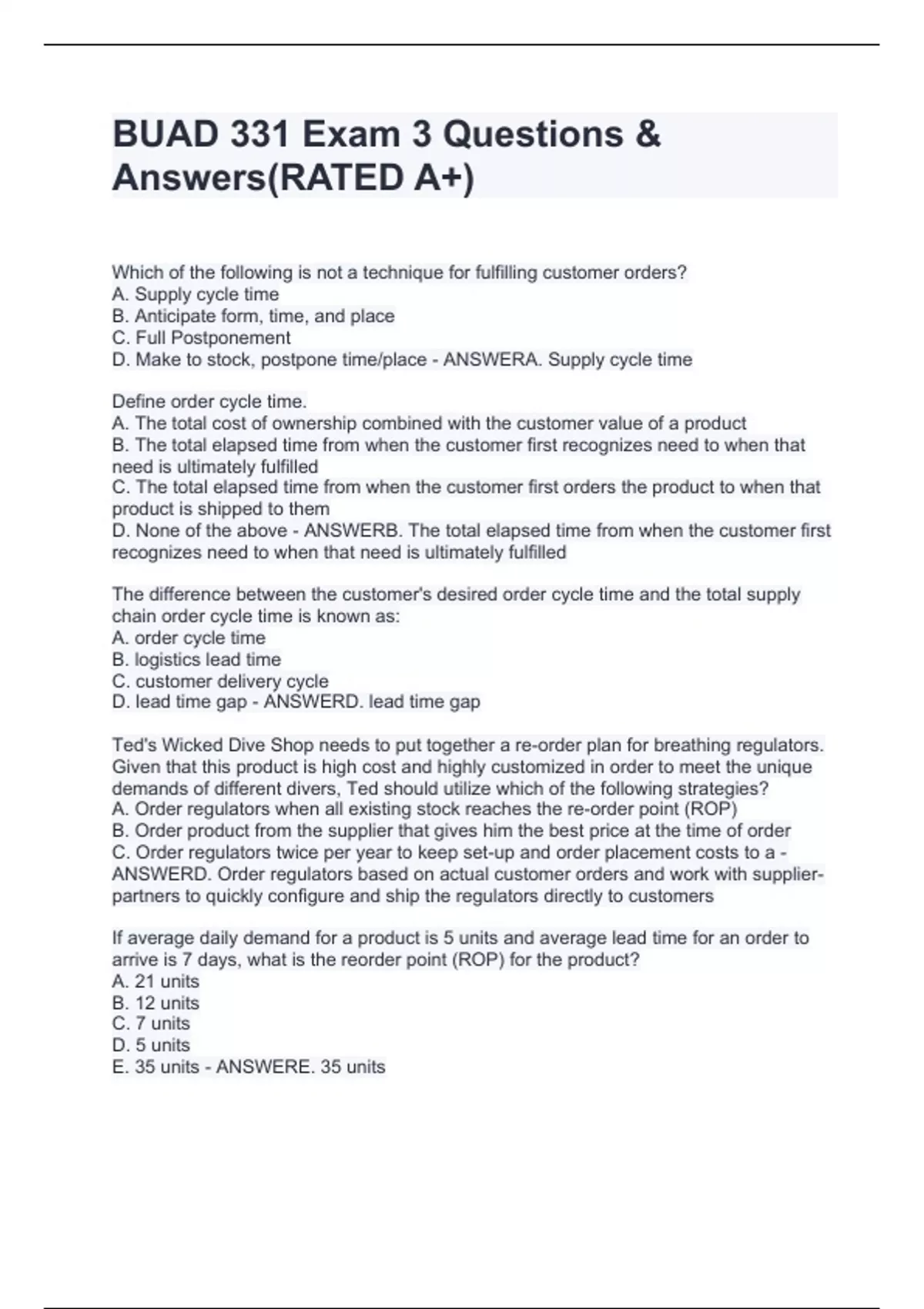Which of the following is not a technique for fulfilling customer orders? A. Supply cycle time B. Anticipate form, time, and place C. Full Postponement D. Make to stock, postpone time/place - ANSWERA. Supply cycle time Define order cycle time. A. The total cost of ownership combined with the customer value of a product B. The total elapsed time from when the customer first recognizes need to when that need is ultimately fulfilled C. The total elapsed time from when the customer first orders the product to when that product is shipped to them D. None of the above - ANSWERB. The total elapsed time from when the customer first recognizes need to when that need is ultimately fulfilled The difference between the customer's desired order cycle time and the total supply chain order cycle time is known as: A. order cycle time B. logistics lead time C. customer delivery cycle D. lead time gap - ANSWERD. lead time gap Ted's Wicked Dive Shop needs to put together a re-order plan for breathing regulators. Given that this product is high cost and highly customized in order to meet the unique demands of different divers, Ted should utilize which of the following strategies? A. Order regulators when all existing stock reaches the re-order point (ROP) B. Order product from the supplier that gives him the best price at the time of order C. Order regulators twice per year to keep set-up and order placement costs to a - ANSWERD. Order regulators based on actual customer orders and work with supplier-partners to quickly configure and ship the regulators directly to customers If average daily demand for a product is 5 units and average lead time for an order to arrive is 7 days, what is the reorder point (ROP) for the product? A. 21 units B. 12 units C. 7 units D. 5 units E. 35 units - ANSWERE. 35 units Ted and his friend Matt start a new company called Crabman Auto Parts. They have heard about agile order fulfillment and are interested in implementing it to decrease costs. Which of the following best describes the strategy Crabman Auto Parts should