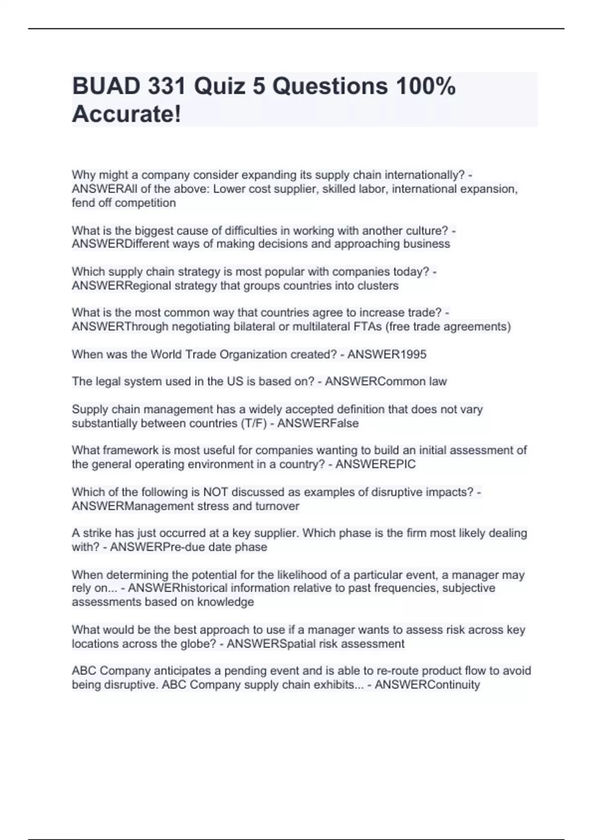 Why might a company consider expanding its supply chain internationally? - ANSWERAll of the above: Lower cost supplier, skilled labor, international expansion, fend off competition What is the biggest cause of difficulties in working with another culture? - ANSWERDifferent ways of making decisions and approaching business Which supply chain strategy is most popular with companies today? - ANSWERRegional strategy that groups countries into clusters What is the most common way that countries agree to increase trade? - ANSWERThrough negotiating bilateral or multilateral FTAs (free trade agreements) When was the World Trade Organization created? - ANSWER1995 The legal system used in the US is based on? - ANSWERCommon law Supply chain management has a widely accepted definition that does not vary substantially between countries (T/F) - ANSWERFalse What framework is most useful for companies wanting to build an initial assessment of the general operating environment in a country? - ANSWEREPIC Which of the following is NOT discussed as examples of disruptive impacts? - ANSWERManagement stress and turnover A strike has just occurred at a key supplier. Which phase is the firm most likely dealing with? - ANSWERPre-due date phase When determining the potential for the likelihood of a particular event, a manager may rely on... - ANSWERhistorical information relative to past frequencies, subjective assessments based on knowledge What would be the best approach to use if a manager wants to assess risk across key locations across the globe? - ANSWERSpatial risk assessment ABC Company anticipates a pending event and is able to re-route product flow to avoid being disruptive. ABC Company supply chain exhibits... - ANSWERContinuity Li