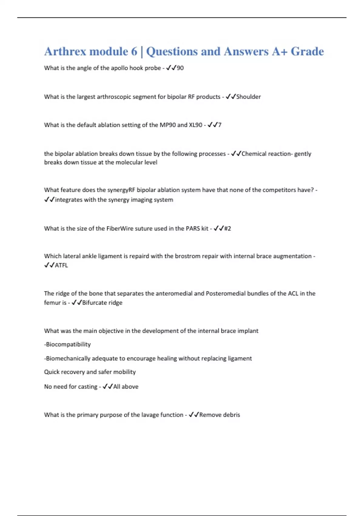 What is the angle of the apollo hook probe - 90 What is the largest arthroscopic segment for bipolar RF products - Shoulder What is the default ablation setting of the MP90 and XL90 - 7 the bipolar ablation breaks down tissue by the following processes - Chemical reaction- gently breaks down tissue at the molecular level What feature does the synergyRF bipolar ablation system have that none of the competitors have? - integrates with the synergy imaging system What is the size of the FiberWire suture used in the PARS kit - #2 Which lateral ankle ligament is repaird with the brostrom repair with internal brace augmentation - ATFL The ridge of the bone that separates the anteromedial and Posteromedial bundles of the ACL in the femur is - Bifurcate ridg