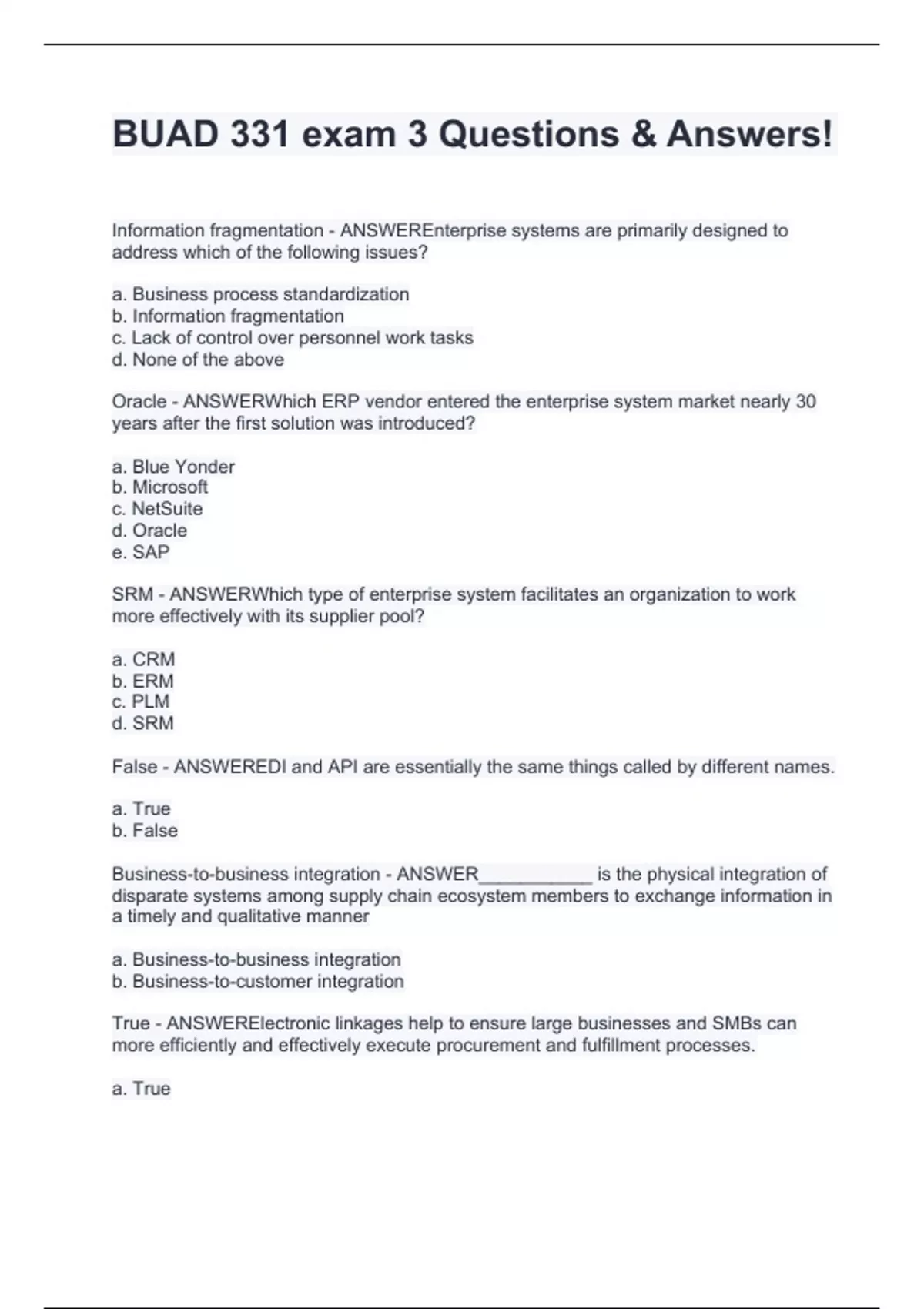 Information fragmentation - ANSWEREnterprise systems are primarily designed to address which of the following issues? a. Business process standardization b. Information fragmentation c. Lack of control over personnel work tasks d. None of the above Oracle - ANSWERWhich ERP vendor entered the enterprise system market nearly 30 years after the first solution was introduced? a. Blue Yonder b. Microsoft c. NetSuite d. Oracle e. SAP SRM - ANSWERWhich type of enterprise system facilitates an organization to work more effectively with its supplier pool? a. CRM b. ERM c. PLM d. SRM False - ANSWEREDI and API are essentially the same things called by different names. a. True b. False Business-to-business integration - ANSWER___________ is the physical integration of disparate systems among supply chain ecosystem members to exchange information in a timely and qualitative manner a. Business-to-business integration b. Business-to-customer integration True - ANSWERElectronic linkages help to ensure large businesses and SMBs can more efficiently and effectively execute procurement and fulfillment processes. a. True b.